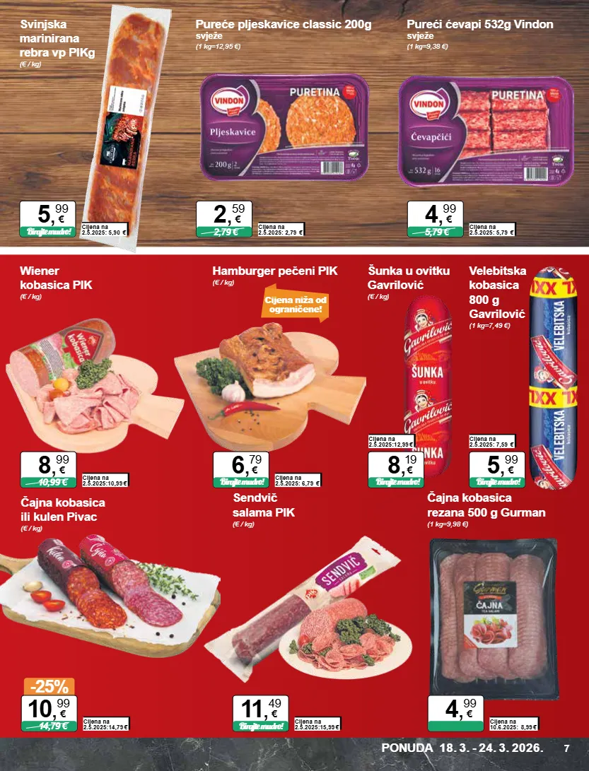 cijena na 2.5.2025: 5,90 € birajte mudro! 5 , 99 € pureće pljeskavice classic 200g svježe (1 kg=12,95 €) svinjska marinirana rebra vp pik g (€ / kg) cijena na 2.5.2025: 2,79 € 2,79 € 2 , 59 € pureći ćevapi 532g vindon svježe (1 kg=9,38 €) cijena na 2.5.2025: 5,79 € 5,79 € 4 , 99 € šunka u ovitku gavrilović (€ / kg) cijena na 2.5.2025:12,99 € birajte mudro! 8 , 19 € velebitska kobasica 800 g gavrilović (1 kg=7,49 €) cijena na 2.5.2025: 7,59 € birajte mudro! 5 , 99 € čajna kobasica ili kulen pivac (€ / kg) cijena na 2.5.2025:14,79 € -25% 14,79 € 10 , 99 € wiener kobasica pik (€ / kg) cijena na 2.5.2025:10,99 € 10,99 € 8 , 99 € cijena niža od ograničene! hamburger pečeni pik (€ / kg) cijena na 2.5.2025: 6,79 € birajte mudro! 6 , 79 € sendvič salama pik (€ / kg) cijena na 2.5.2025:15,99 € birajte mudro! 11 , 49 € čajna kobasica rezana 500 g gurman (1 kg=9,98 €) cijena na 10.6.2025: 8,99 € 4 , 99 € ponuda 18. 3. - 24. 3. 2026. 7