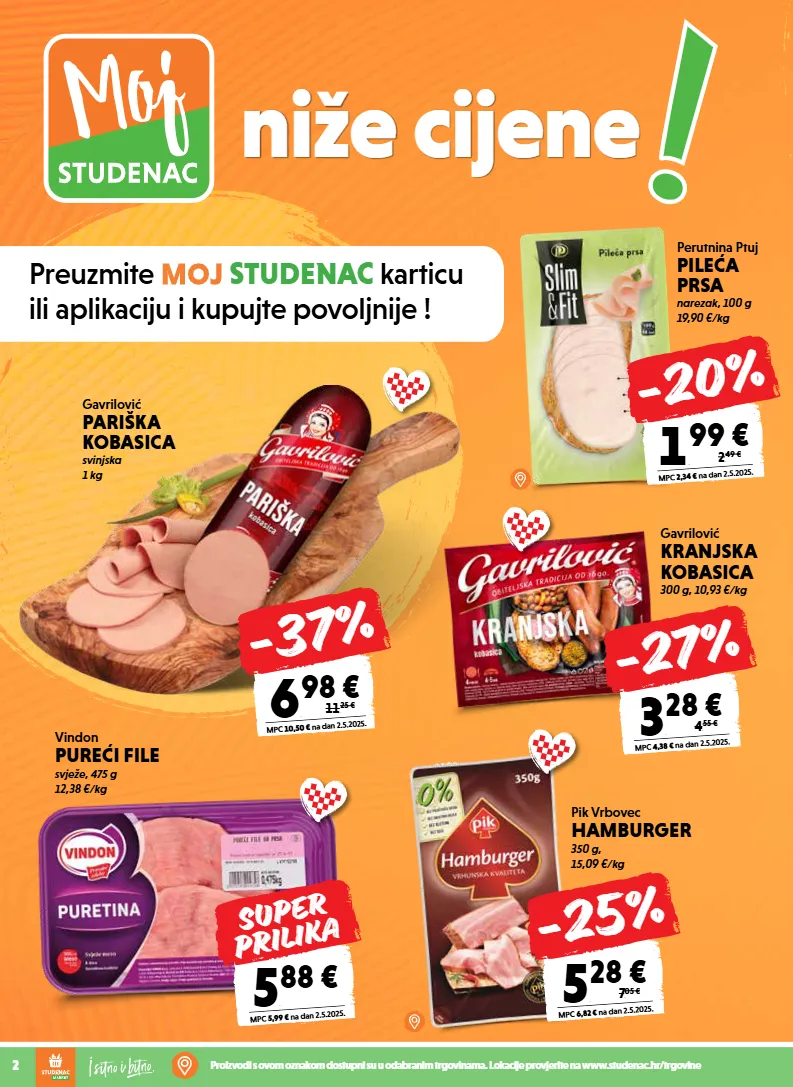 preuzmite moj studenac karticu ili aplikaciju i kupujte povoljnije ! niže cijene 2 proizvodi s ovom oznakom dostupni su u odabranim trgovinama. lokacije provjerite na www.studenac.hr/trgovine vindon pureći file svježe, 475 g 12,38 €/kg 5 , 88 € mpc 5,99 € na dan 2.5.2025. super prilika gavrilović pariška kobasica svinjska 1 kg 6 , 98 € mpc 10,50 € na dan 2.5.2025. 11, 25 € -37% gavrilović kranjska kobasica 300 g, 10,93 €/kg 3 , 28 € mpc 4,38 € na dan 2.5.2025. 4, 55 € -27% perutnina ptuj pileća prsa narezak, 100 g 19,90 €/kg 1 , 99 € mpc 2,34 € na dan 2.5.2025. 2, 49 € -20% pik vrbovec hamburger 350 g, 15,09 €/kg 5 , 28 € mpc 6,82 € na dan 2.5.2025. 7, 05 € -25%