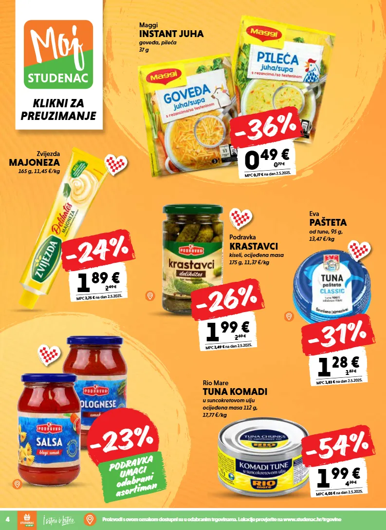 klikni za preuzimanje 4 proizvodi s ovom oznakom dostupni su u odabranim trgovinama. lokacije provjerite na www.studenac.hr/trgovine -23% podravka umaci odabrani asortiman podravka krastavci kiseli, ocijeđena masa 175 g, 11,37 €/kg 1 , 99 € mpc 2,49 € na dan 2.5.2025. 2, 69 € -26% maggi instant juha goveđa, pileća 37 g 0 , 49 € mpc 0,77 € na dan 2.5.2025. 0, 77 € -36% zvijezda majoneza 165 g, 11,45 €/kg 1 , 89 € mpc 2,75 € na dan 2.5.2025. 2, 49 € -24% eva pašteta od tune, 95 g, 13,47 €/kg 1 , 28 € mpc 1,83 € na dan 2.5.2025. 1, 87 € -31% rio mare tuna komadi u suncokretovom ulju ocijeđena masa 112 g, 17,77 €/kg 1 , 99 € mpc 4,05 € na dan 2.5.2025. 4, 39 € -54%