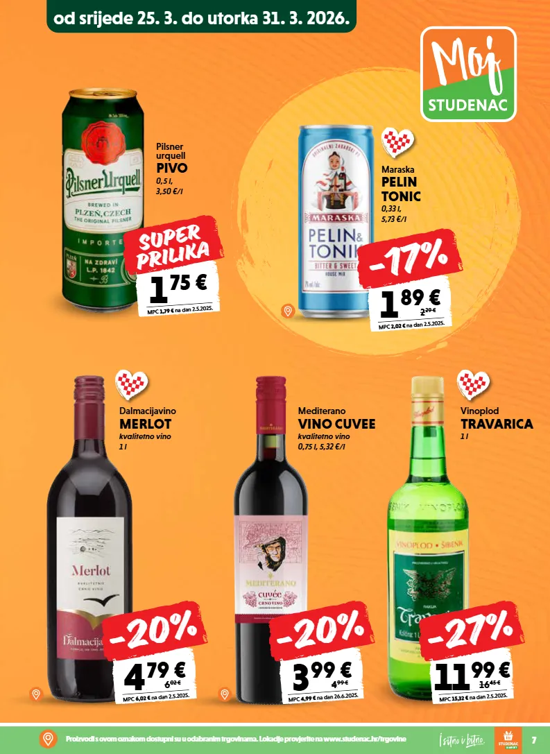 od srijede 25. 3. do utorka 31. 3. 2026. 7 proizvodi s ovom oznakom dostupni su u odabranim trgovinama. lokacije provjerite na www.studenac.hr/trgovine pilsner urquell pivo 0,5 l, 3,50 €/l 1 , 75 € mpc 1,79 € na dan 2.5.2025. super prilika maraska pelin tonic 0,33 l, 5,73 €/l vinoplod travarica 1 l 11 , 99 € mpc 15,32 € na dan 2.5.2025. 16, 45 € -27% dalmacijavino merlot kvalitetno vino 1 l mediterano vino cuvee kvalitetno vino 0,75 l, 5,32 €/l 4 , 79 € mpc 6,02 € na dan 2.5.2025. 6, 02 € -20% 1 , 89 € mpc 2,02 € na dan 2.5.2025. 2, 29 € -17% 3 , 99 € mpc 4,99 € na dan 26.6.2025. 4, 99 € -20%