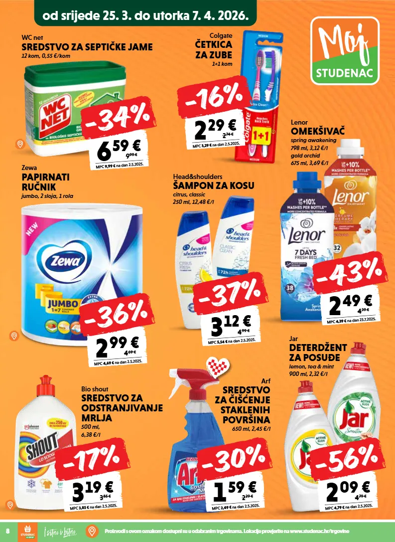 od srijede 25. 3. do utorka 7. 4. 2026. 8 proizvodi s ovom oznakom dostupni su u odabranim trgovinama. lokacije provjerite na www.studenac.hr/trgovine zewa papirnati ručnik jumbo, 2 sloja, 1 rola arf sredstvo za čišćenje staklenih površina 650 ml, 2,45 €/l 2 , 99 € mpc 4,69 € na dan 2.5.2025. 4, 69 € -36% head&shoulders šampon za kosu citrus, classic 250 ml, 12,48 €/l wc net sredstvo za septičke jame 12 kom, 0,55 €/kom 6 , 59 € mpc 9,99 € na dan 2.5.2025. 9, 99 € -34% bio shout sredstvo za odstranjivanje mrlja 500 ml, 6,38 €/l jar deterdžent za posuđe lemon, tea & mint 900 ml, 2,32 €/l 2 , 09 € mpc 4,79 € na dan 2.5.2025. 4, 79 € -56% 1 , 59 € mpc 2,49 € na dan 2.5.2025. 2, 29 € -30% 3 , 19 € mpc 3,85 € na dan 2.5.2025. 3, 85 € -17% 3 , 12 € mpc 5,54 € na dan 2.5.2025. 4, 99 € -37% 2 , 49 € mpc 4,39 € na dan 23.7.2025. 4, 39 € -43% lenor omekšivač spring awakening 798 ml, 3,12 €/l gold orchid 675 ml, 3,69 €/l colgate četkica za zube 1+1 kom 2 , 29 € mpc 3,29 € na dan 2.5.2025. 2, 74 € -16%