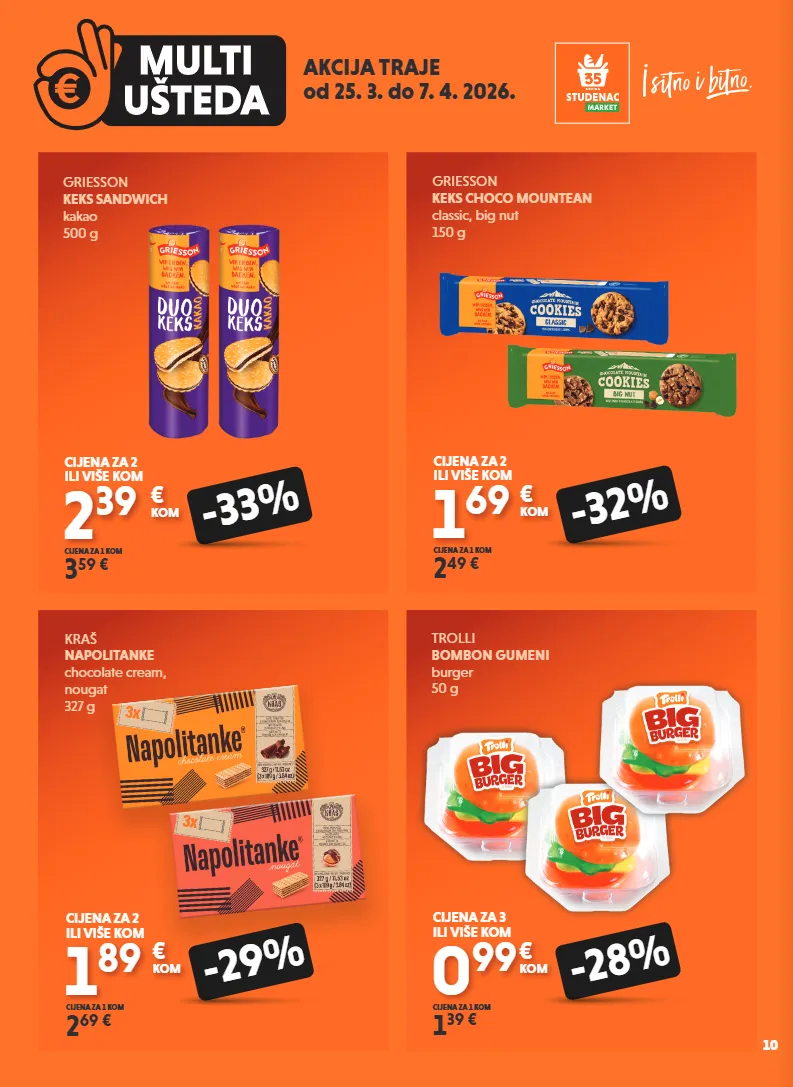 akcija traje od 25. 3. do 7. 4. 2026. 10 griesson keks sandwich kakao 500 g 2 39 3 59 € cijena za 1 kom -33% cijena za 2 ili više kom € kom griesson keks choco mountean classic, big nut 150 g 1 69 2 49 € cijena za 1 kom -32% cijena za 2 ili više kom € kom kraš napolitanke chocolate cream, nougat 327 g 1 89 2 69 € cijena za 1 kom -29% cijena za 2 ili više kom € kom trolli bombon gumeni burger 50 g 0 99 1 39 € cijena za 1 kom -28% cijena za 3 ili više kom € kom