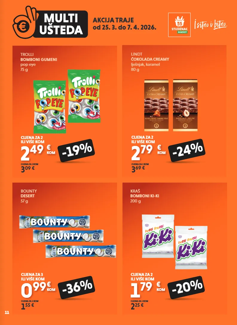 akcija traje od 25. 3. do 7. 4. 2026. 11 trolli bomboni gumeni pop eye 75 g 2 49 3 09 € cijena za 1 kom -19% cijena za 2 ili više kom € kom lindt čokolada creamy lješnjak, karamel 80 g 2 79 3 69 € cijena za 1 kom -24% cijena za 2 ili više kom € kom bounty desert 57 g 0 99 1 55 € cijena za 1 kom -36% cijena za 3 ili više kom € kom kraš bomboni ki-ki 200 g 1 79 2 25 € cijena za 1 kom -20% cijena za 2 ili više kom € kom