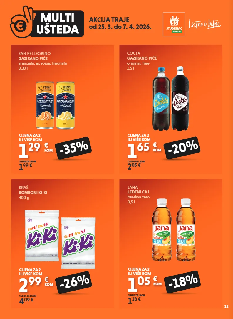 akcija traje od 25. 3. do 7. 4. 2026. 12 kraš bomboni ki-ki 400 g 2 99 4 09 € cijena za 1 kom -26% cijena za 2 ili više kom € kom san pellegrino gazirano piće aranciata, ar. rossa, limonata 0,33 l 1 29 1 99 € cijena za 1 kom -35% cijena za 2 ili više kom € kom cocta gazirano piće original, free 1,5 l 1 65 2 05 € cijena za 1 kom -20% cijena za 2 ili više kom € kom jana ledeni čaj breskva zero 0,5 l 1 05 1 28 € cijena za 1 kom -18% cijena za 2 ili više kom € kom
