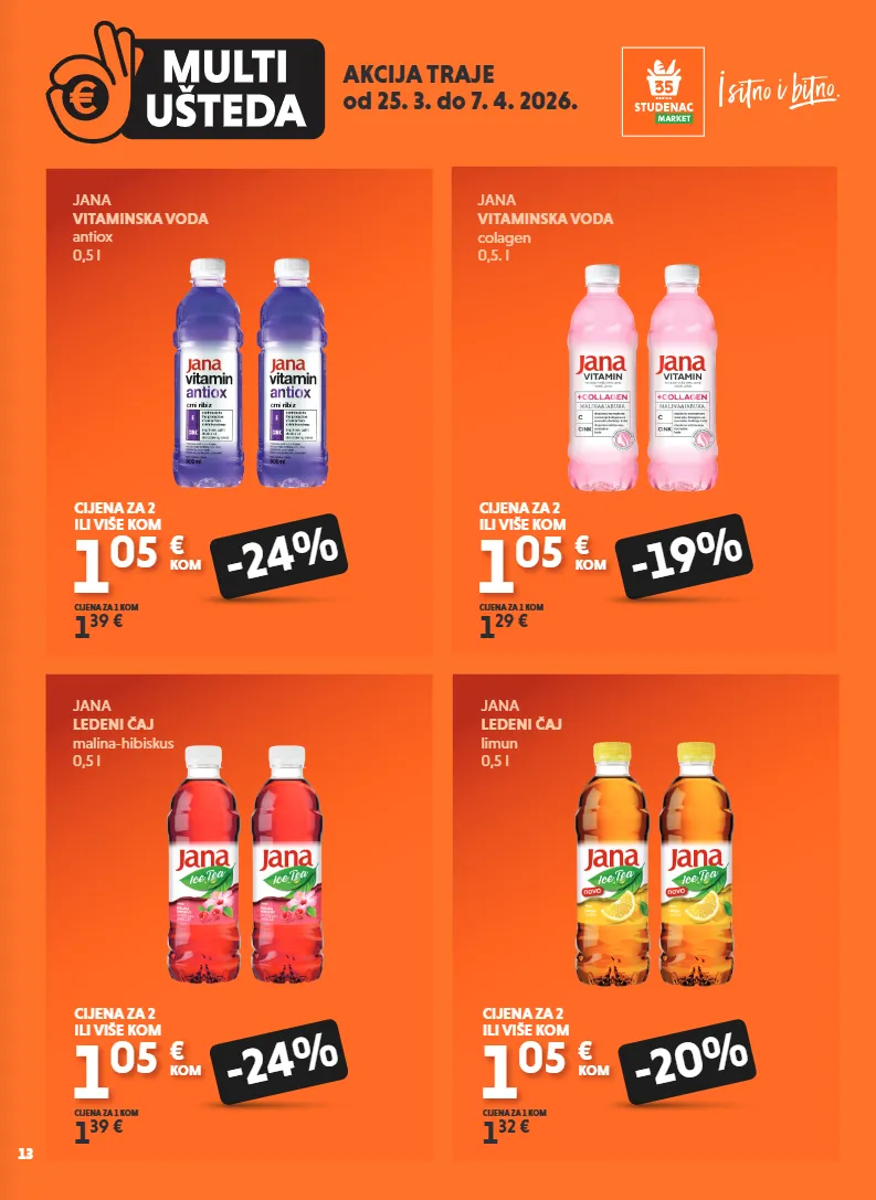akcija traje od 25. 3. do 7. 4. 2026. 13 jana ledeni čaj malina-hibiskus 0,5 l 1 05 1 39 € cijena za 1 kom -24% cijena za 2 ili više kom € kom jana ledeni čaj limun 0,5 l 1 05 1 32 € cijena za 1 kom -20% cijena za 2 ili više kom € kom jana vitaminska voda colagen 0,5. l 1 05 1 29 € cijena za 1 kom -19% cijena za 2 ili više kom € kom jana vitaminska voda antiox 0,5 l 1 05 1 39 € cijena za 1 kom -24% cijena za 2 ili više kom € kom