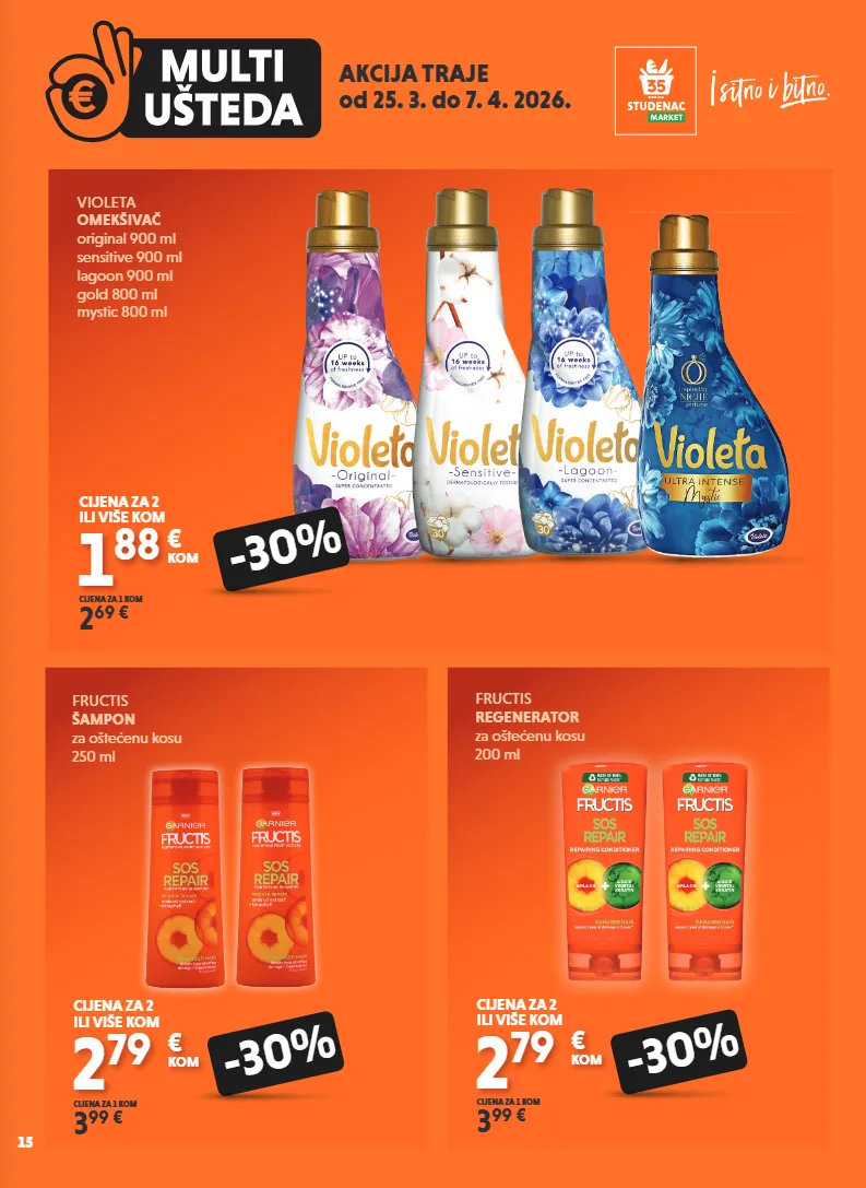 AKCIJA TRAJE od 25. 3. do 7. 4. 2026. 15 VIOLETA OMEKŠIVAČ original 900 ml sensitive 900 ml lagoon 900 ml gold 800 ml mystic 800 ml € KOM FRUCTIS ŠAMPON za oštećenu kosu 250 ml 2 79 3 99 € CIJENA ZA 1 KOM -30% CIJENA ZA 2 ILI VIŠE KOM € KOM FRUCTIS REGENERATOR za oštećenu kosu 200 ml 2 79 3 99 € CIJENA ZA 1 KOM -30% CIJENA ZA 2 ILI VIŠE KOM € KOM 1 88 2 69 € CIJENA ZA 1 KOM -30% CIJENA ZA 2 ILI VIŠE KOM