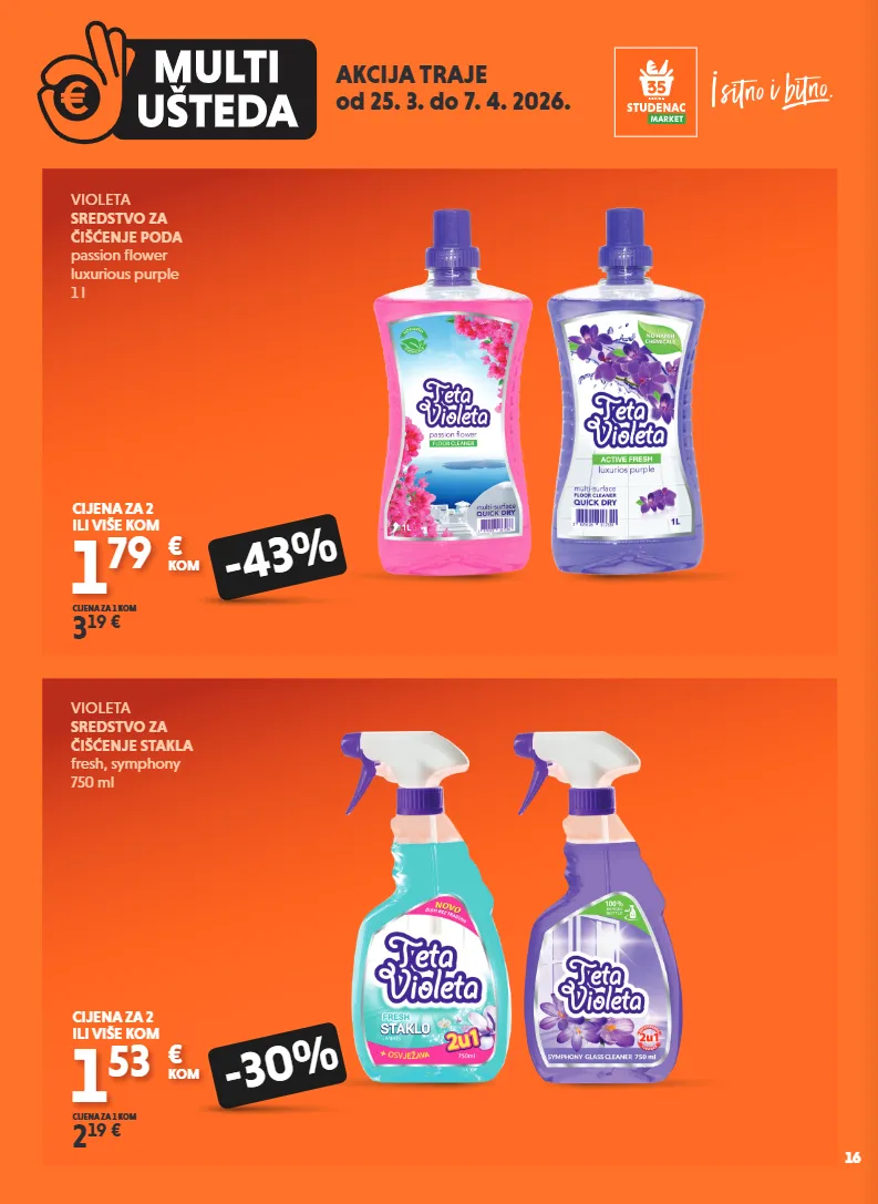 AKCIJA TRAJE od 25. 3. do 7. 4. 2026. 16 VIOLETA SREDSTVO ZA ČIŠĆENJE PODA passion flower luxurious purple 1 l 1 79 3 19 € CIJENA ZA 1 KOM -43% CIJENA ZA 2 ILI VIŠE KOM € KOM VIOLETA SREDSTVO ZA ČIŠĆENJE STAKLA fresh, symphony 750 ml 1 53 2 19 € CIJENA ZA 1 KOM -30% CIJENA ZA 2 ILI VIŠE KOM € KOM