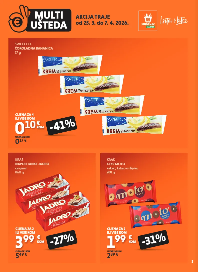 akcija traje od 25. 3. do 7. 4. 2026. 2 sweet co. čokoladna bananica 17 g 0 10 0 17 € cijena za 1 kom -41% cijena za 4 ili više kom € kom kraš napolitanke jadro original 860 g 3 99 5 49 € cijena za 1 kom -27% cijena za 2 ili više kom € kom kraš keks moto kakao, kakao+mlijeko 288 g 1 99 2 89 € cijena za 1 kom -31% cijena za 2 ili više kom € kom