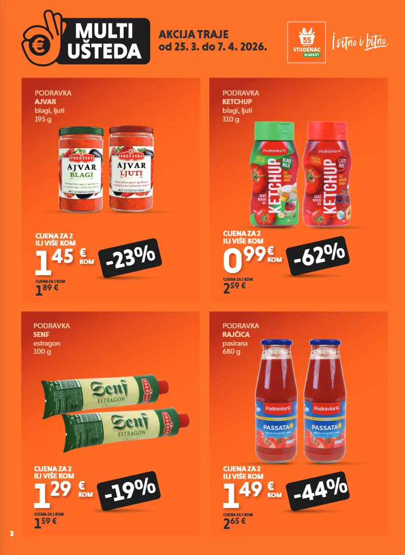 akcija traje od 25. 3. do 7. 4. 2026. 3 podravka ajvar blagi, ljuti 195 g 1 45 1 89 € cijena za 1 kom -23% cijena za 2 ili više kom € kom podravka ketchup blagi, ljuti 310 g 0 99 2 59 € cijena za 1 kom -62% cijena za 2 ili više kom € kom podravka senf estragon 100 g 1 29 1 59 € cijena za 1 kom -19% cijena za 2 ili više kom € kom podravka rajčica pasirana 680 g 1 49 2 65 € cijena za 1 kom -44% cijena za 2 ili više kom € kom