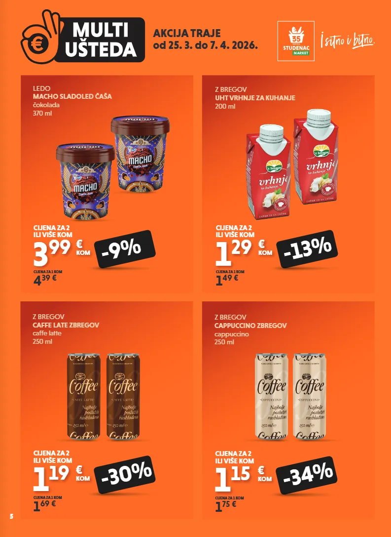 akcija traje od 25. 3. do 7. 4. 2026. 5 ledo macho sladoled čaša čokolada 370 ml 3 99 4 39 € cijena za 1 kom -9% cijena za 2 ili više kom € kom z bregov uht vrhnje za kuhanje 200 ml 1 29 1 49 € cijena za 1 kom -13% cijena za 2 ili više kom € kom z bregov caffe late zbregov caffe latte 250 ml 1 19 1 69 € cijena za 1 kom -30% cijena za 2 ili više kom € kom z bregov cappuccino zbregov cappuccino 250 ml 1 15 1 75 € cijena za 1 kom -34% cijena za 2 ili više kom € kom
