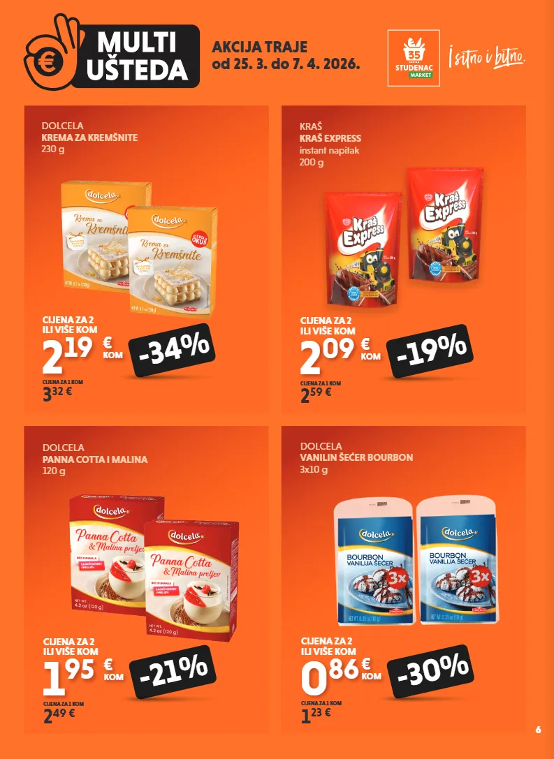 akcija traje od 25. 3. do 7. 4. 2026. 6 dolcela krema za kremšnite 230 g 2 19 3 32 € cijena za 1 kom -34% cijena za 2 ili više kom € kom dolcela panna cotta i malina 120 g 1 95 2 49 € cijena za 1 kom -21% cijena za 2 ili više kom € kom kraš kraš express instant napitak 200 g 2 09 2 59 € cijena za 1 kom -19% cijena za 2 ili više kom € kom dolcela vanilin šećer bourbon 3x10 g 0 86 1 23 € cijena za 1 kom -30% cijena za 2 ili više kom € kom