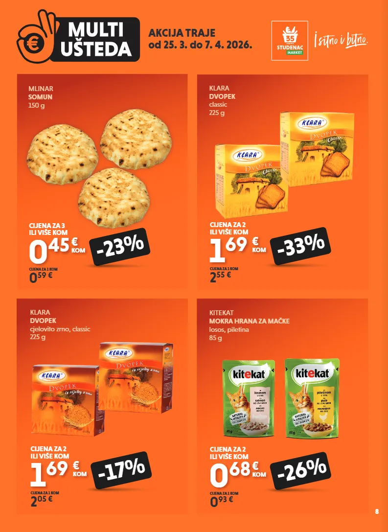 akcija traje od 25. 3. do 7. 4. 2026. 8 mlinar somun 150 g 0 45 0 59 € cijena za 1 kom -23% cijena za 3 ili više kom € kom klara dvopek cjelovito zrno, classic 225 g 1 69 2 05 € cijena za 1 kom -17% cijena za 2 ili više kom € kom klara dvopek classic 225 g 1 69 2 55 € cijena za 1 kom -33% cijena za 2 ili više kom € kom kitekat mokra hrana za mačke losos, piletina 85 g 0 68 0 93 € cijena za 1 kom -26% cijena za 2 ili više kom € kom
