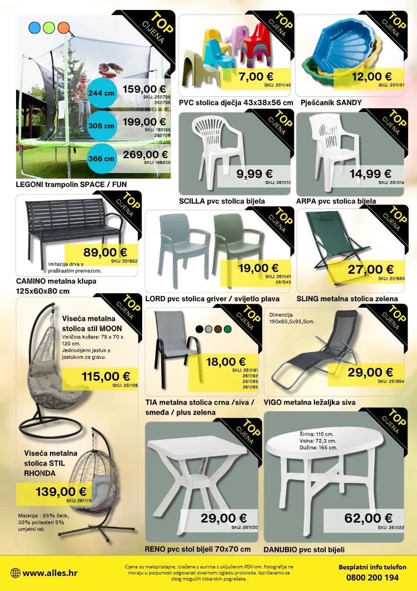 PVC st olica dječja 43x38x56 cm Pje š ćanik SANDY LEGONI tr am p olin SPACE / FUN 159 , 00 € SKU : 260795 260796 244 cm TOP CIJENA TOP CIJENA TOP CIJENA 199 , 00 € SKU : 189195 260798 305 cm 269 , 00 € SKU : 188200 366 cm 7 , 00 € SKU : 261046 12 , 00 € SKU : 261051 CAMINO me t alna kl up a 125x60x80 cm TOP CIJENA 89 , 00 € SKU : 251852 SCILLA pv c st olica bijela TOP CIJENA 9 , 99 € SKU : 261010 ARPA pv c st olica bijela TOP CIJENA 14 , 99 € SKU : 261014 LORD pv c st olica g r i v e r / sv ije t lo p la v a TOP CIJENA 19 , 00 € SKU : 261041 261043 SLING me t alna st olica z elena TOP CIJENA 27 , 00 € SKU : 251865 TIA me t alna st olica c r na / s i v a / s međa / p l us z elena TOP CIJENA VIGO me t alna le ž aljka s i v a TOP CIJENA 29 , 00 € SKU : 251854 18 , 00 € SKU : 261091 261092 261093 261095 TOP CIJENA 115 , 00 € SKU : 261106 139 , 00 € SKU : 261105 TOP CIJENA TOP CIJENA 62 , 00 € SKU : 261022 29 , 00 € SKU : 261030 Besplatni info telefon 0800 200 194 Cijene su maloprodajne, izražene u eurima s uključenim PDV-om. Fotografije ne moraju u potpunosti odgovarati stvarnom izgledu proizvoda. Ispričavamo se zbog mogućih tiskarskih pogrešaka. www.alles.hr Vi s eća me t alna st olica st il MOON Vi s eća me t alna st olica STIL RHONDA RENO pv c st ol bijeli 70x70 cm DANUBIO pv c st ol bijeli Ši r ina : 110 cm . V s ina : 72 , 3 cm . D už ina : 165 cm . Imi t acija d rv a s pr a š ka st im pr ema z om . Dimen z ija 190x60 , 5x95 , 5 cm . Veličina ko š a r e : 79 x 70 x 120 cm . Jednodijelni ja stu k s ja stu kom z a gla vu. Ma t e r ijal : 65 % čelik , 30 % p olie st e r i 5 % u mje t ni r a t.