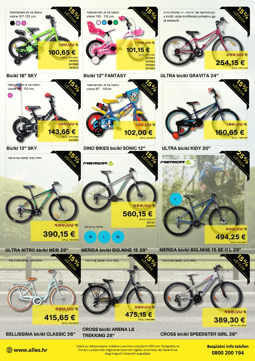 15 % ušteda 189 , 00 € 160 , 65 € sku : 240687 243312 240688 243313 bicikl 16 " sky 15 % ušteda 119 , 00 € 101 , 15 € sku : 251539 251554 251553 251540 251552 bicikl 12 " fantasy 15 % ušteda 169 , 00 € 143 , 65 € sku : 240684 240685 15 % ušteda 120 , 00 € 102 , 00 € sku : 251814 15 % ušteda 299 , 00 € 254 , 15 € sku : 241763 ultra bicikl gravita 24 " 15 % ušteda 189 , 00 € 160 , 65 € sku : 168158 25 % ušteda 659 , 00 € 494 , 25 € sku : 257837 bicikl 12 " sky dino bikes bicikl sonic 12 " ultra bicikl kidy 20 " merida bicikl big . nine 15 se i 1 l 29 " 15 % ušteda 659 , 00 € 560 , 15 € sku : 250312 250311 250313 merida bicikl big . nine 15 29 " 15 % ušteda ultra nitro bicikl mdb 29 " 459 , 00 € 390 , 15 € sku : 189068 15 % ušteda 458 , 00 € 389 , 30 € sku : 201832 15 % ušteda 559 , 00 € 475 , 15 € sku : 249984 15 % ušteda 489 , 00 € 415 , 65 € sku : 260639 l m xl l besplatni info telefon 0800 200 194 cijene su maloprodajne, izražene u eurima s uključenim pdv-om. fotografije ne moraju u potpunosti odgovarati stvarnom izgledu proizvoda. ispričavamo se zbog mogućih tiskarskih pogrešaka. www.alles.hr namijenjen je z a djec u v i s ine 107 - 125 cm . namijenjen je z a djec u v i s ine 100 - 110 cm . namijenjen je z a djec u v i s ine 85 - 110 cm . namijenjen je z a djec u v i s ine 87 - 110 cm b r oj b rz ina : 21. bicikli s e i sp o ru č u j u u k ut iji i pr ije ko r i št enja p o tr ebno ga je s a st a v i t i . cross bicikl speedster girl 26 " cross bicikl arena ls trekking 28 " bellissima bicikl classic 26 " veličina r ame : veličina r ame : 440 mm . veličina r ame : 460 mm . veličina r ame : 480 mm . veličina r ame : 320 mm .