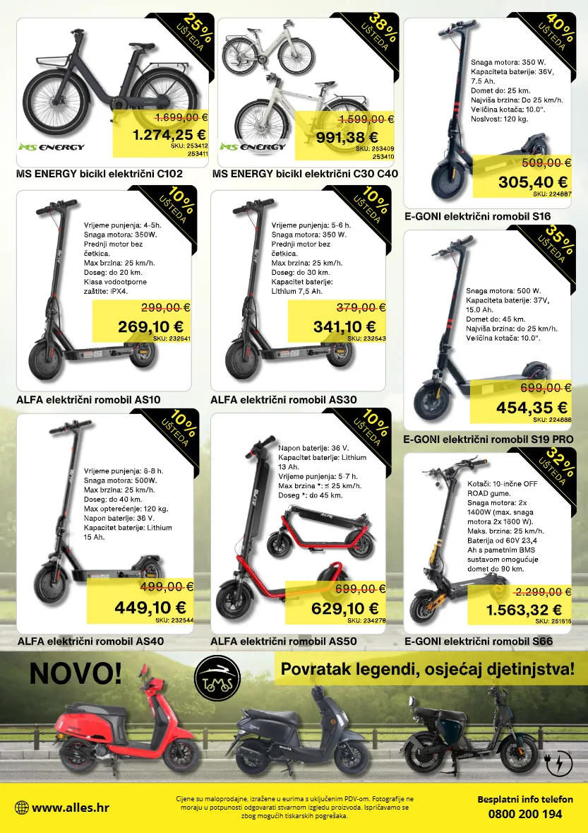 25 % ušteda 1.699 , 00 € 1.274 , 25 € sku : 253412 253411 38 % ušteda 40 % ušteda 509 , 00 € 305 , 40 € sku : 224887 ms energy bicikl elek tr ični c 102 ms energy bicikl elek tr ični c 30 c 40 e - goni elek tr ični r omobil s 16 1.599 , 00 € 991 , 38 € sku : 253409 253410 35 % ušteda 699 , 00 € 454 , 35 € sku : 224888 e - goni elek tr ični r omobil s 19 pro 32 % ušteda 2.299 , 00 € 1.563 , 32 € sku : 251515 10 % ušteda 299 , 00 € 269 , 10 € sku : 232541 alfa elek tr ični r omobil as 10 10 % ušteda 499 , 00 € 449 , 10 € sku : 232544 10 % ušteda 379 , 00 € 341 , 10 € sku : 232543 alfa elek tr ični r omobil as 30 10 % ušteda 699 , 00 € 629 , 10 € sku : 234278 besplatni info telefon 0800 200 194 cijene su maloprodajne, izražene u eurima s uključenim pdv-om. fotografije ne moraju u potpunosti odgovarati stvarnom izgledu proizvoda. ispričavamo se zbog mogućih tiskarskih pogrešaka. www.alles.hr novo ! po vr a t ak legendi , o s jećaj dje t inj stv a ! e - goni elek tr ični r omobil s 66 snaga mo t o r a : 500 w . ka p aci t e t a ba t e r ije : 37 v , 15.0 ah . dome t do : 45 km . naj v i š a b rz ina : do 25 km / h . veličina ko t ača : 10.0 " . snaga mo t o r a : 350 w . ka p aci t e t a ba t e r ije : 36 v , 7.5 ah . dome t do : 25 km . naj v i š a b rz ina : do 25 km / h . veličina ko t ača : 10.0 " . no s i v o st : 120 kg . ko t ači : 10 - inčne off road g u me . snaga mo t o r a : 2x 1400 w ( ma x. s naga mo t o r a 2x 1600 w ) . mak s. b rz ina : 25 km / h . ba t e r ija od 60 v 23 , 4 ah s p ame t nim bms sust a v om omog u ć u je dome t do 90 km . v r ijeme pu njenja : 4 - 5 h . snaga mo t o r a : 350 w . p r ednji mo t o r be z če t kica . ma x b rz ina : 25 km / h . do s eg : do 20 km . kla s a v odoo tp o r ne z a št i t e : ipx 4. alfa elek tr ični r omobil as 40 v r ijeme pu njenja : 6 - 8 h . snaga mo t o r a : 500 w . ma x b rz ina : 25 km / h . do s eg : do 40 km . ma x o pt e r ećenje : 120 kg . na p on ba t e r ije : 36 v . ka p aci t e t ba t e r ije : li t hi u m 15 ah . v r ijeme pu njenja : 5 - 6 h . snaga mo t o r a : 350 w . p r ednji mo t o r be z če t k ica . ma x b rz ina : 25 km / h . do s eg : do 30 km . ka p aci t e t ba t e r ije : li t hi u m 7 , 5 ah . alfa elek tr ični r omobil as 50 na p on ba t e r ije : 36 v . ka p aci t e t ba t e r ije : li t hi u m 13 ah . v r ijeme pu njenja : 5 - 7 h . ma x b rz ina *: ≤ 25 km / h . do s eg *: do 45 km .