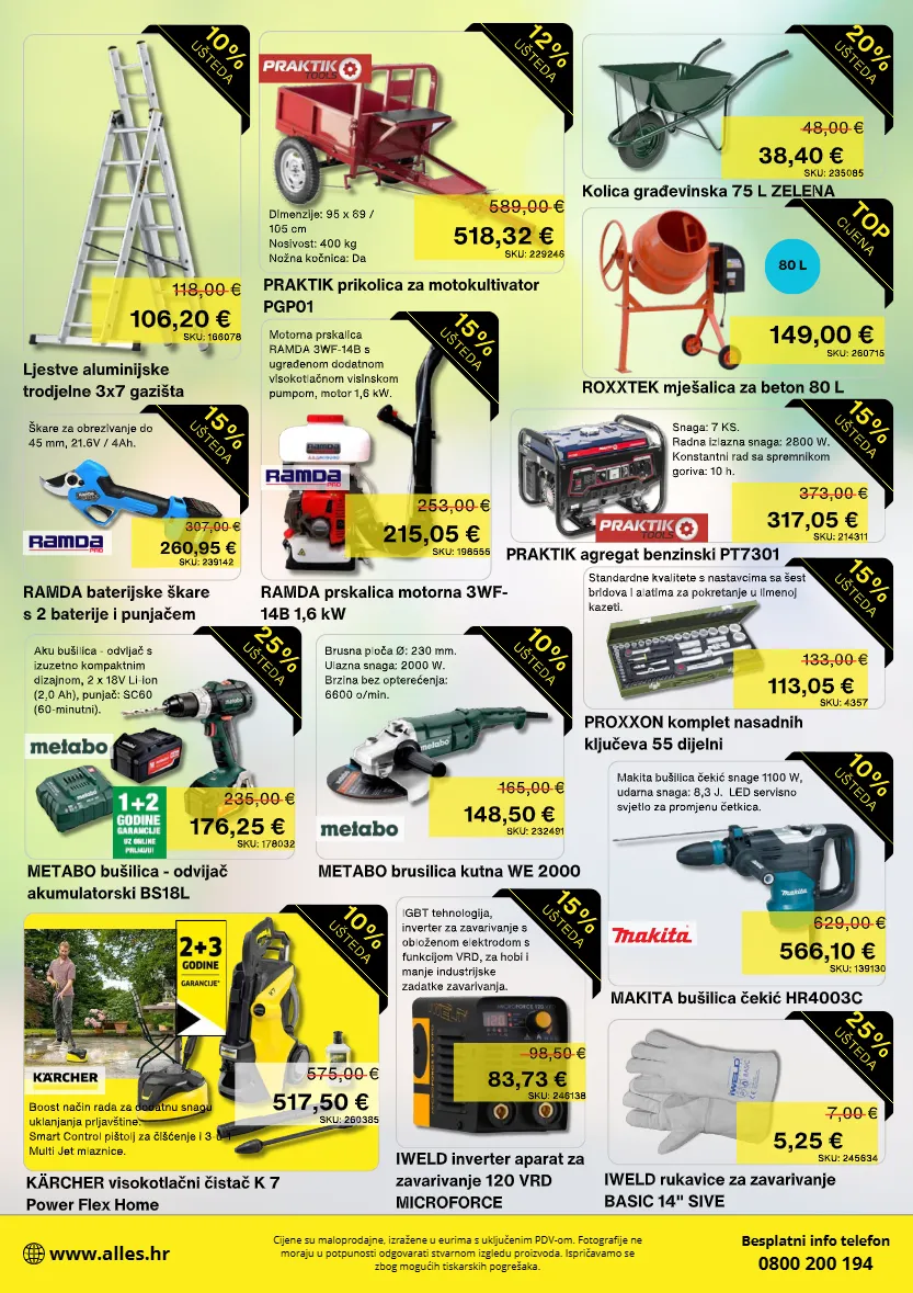 Lje stv e al u minij s ke tr odjelne 3x7 ga z i št a PRAKTIK pr ikolica z a mo t ok u l t i v a t o r PGP 01 10 % UŠTEDA 118 , 00 € 106 , 20 € SKU : 166078 10 % UŠTEDA 575 , 00 € 517 , 50 € SKU : 260385 20 % UŠTEDA 48 , 00 € 38 , 40 € SKU : 235085 RAMDA prs kalica mo t o r na 3 WF - 14 B 1 , 6 kW 15 % UŠTEDA 253 , 00 € 215 , 05 € SKU : 198555 15 % UŠTEDA 307 , 00 € 260 , 95 € SKU : 239142 RAMDA ba t e r ij s ke š ka r e s 2 ba t e r ije i pu njačem 25 % UŠTEDA 235 , 00 € 176 , 25 € SKU : 178032 10 % UŠTEDA 165 , 00 € 148 , 50 € SKU : 232491 10 % UŠTEDA 629 , 00 € 566 , 10 € SKU : 139130 METABO b rus ilica k u t na WE 2000 MAKITA b uš ilica čekić HR 4003 C 15 % UŠTEDA 98 , 50 € 83 , 73 € SKU : 246138 7 , 00 € 5 , 25 € SKU : 245634 25 % UŠTEDA Kolica g r ađe v in s ka 75 L ZELENA 15 % UŠTEDA 373 , 00 € 317 , 05 € SKU : 214311 PRAKTIK ag r ega t ben z in s ki PT 7301 15 % UŠTEDA 133 , 00 € 113 , 05 € SKU : 4357 12 % UŠTEDA 589 , 00 € 518 , 32 € SKU : 229246 TOP CIJENA 149 , 00 € SKU : 260715 80 L Besplatni info telefon 0800 200 194 Cijene su maloprodajne, izražene u eurima s uključenim PDV-om. Fotografije ne moraju u potpunosti odgovarati stvarnom izgledu proizvoda. Ispričavamo se zbog mogućih tiskarskih pogrešaka. www.alles.hr Dimen z ije : 95 x 69 / 105 cm No s i v o st : 400 kg No ž na kočnica : Da KÄRCHER v i s oko t lačni či st ač K 7 Po w e r Fle x Home Boo st način r ada z a doda t n u s nag u u klanjanja pr lja všt ine . Sma rt Con tr ol p i št olj z a či š ćenje i 3 - u - 1 M u l t i Je t mla z nice . Mo t o r na prs kalica RAMDA 3 WF - 14 B s u g r ađenom doda t nom v i s oko t lačnom v i s in s kom pu m p om , mo t o r 1 , 6 kW . Ška r e z a ob r e z i v anje do 45 mm , 21.6 V / 4 Ah . METABO b uš ilica - od v ijač ak u m u l a t o rs ki BS 18 L Ak u b uš ilica - od v ijač s i zuz e t no kom p ak t nim di z ajnom , 2 x 18 V Li - ion ( 2 , 0 Ah ), pu njač : SC 60 ( 60 - min ut ni ) . B rus na p loča Ø : 230 mm . Ula z na s naga : 2000 W . B rz ina be z o pt e r ećenja : 6600 o / min . Maki t a b uš ilica čekić s nage 1100 W , u da r na s naga : 8 , 3 J . LED s e rv i s no sv je t lo z a pr omjen u če t kica . IWELD in v e rt e r a p a r a t z a z a v a r i v anje 120 VRD MICROFORCE IGBT t ehnologija , in v e rt e r z a z a v a r i v anje s oblo ž enom elek tr odom s f u nkcijom VRD , z a hobi i manje ind ustr ij s ke z ada t ke z a v a r i v anja . IWELD ru ka v ice z a z a v a r i v anje BASIC 14 " SIVE Snaga : 7 KS . Radna i z la z na s naga : 2800 W . Kon st an t ni r ad s a spr emnikom go r i v a : 10 h . PROXXON kom p le t na s adnih klj u če v a 55 dijelni S t anda r dne k v ali t e t e s na st a v cima s a š e st b r ido v a i ala t ima z a p ok r e t anje u limenoj ka z e t i . ROXXTEK mje š alica z a be t on 80 L