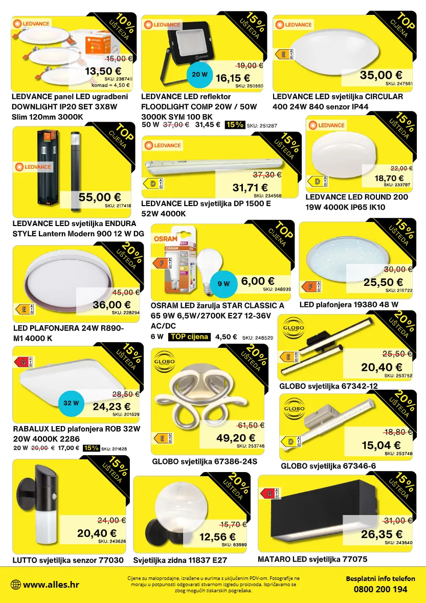 15 % UŠTEDA 10 % UŠTEDA 15 , 00 € 13 , 50 € SKU : 238740 komad = 4 , 50 € 35 , 00 € SKU : 247561 TOP CIJENA LEDVANCE LED r eflek t o r FLOODLIGHT COMP 20 W / 50 W 3000 K SYM 100 BK LEDVANCE LED sv je t iljka CIRCULAR 400 24 W 840 s en z o r IP 44 LEDVANCE p anel LED u g r adbeni DOWNLIGHT IP 20 SET 3 X 8 W Slim 120 mm 3000 K 19 , 00 € 16 , 15 € SKU : 250550 20 W 15 % 50 W 37 , 00 € SKU : 251287 LEDVANCE LED sv je t iljka D P 1500 E 52 W 4000 K 37 , 30 € 31 , 71 € SKU : 234568 15 % UŠTEDA LEDVANCE LED ROUND 200 19 W 4000 K IP 65 IK 10 22 , 00 € 18 , 70 € SKU : 233787 15 % UŠTEDA LEDVANCE LED sv je t iljka ENDUR A STYLE Lan t e r n Mode r n 900 12 W DG 55 , 00 € SKU : 217416 TOP CIJENA OSRAM LED ž a ru lja STAR CLASSIC A 65 9 W 6 , 5 W / 2700 K E 27 12 - 36 V AC / DC 6 , 00 € SKU : 248939 TOP CIJENA 9 W 6 W LED PLAFONJE RA 24 W R 890 - M 1 4000 K 45 , 00 € 36 , 00 € SKU : 228294 20 % UŠTEDA LED p lafonje r a 19380 48 W 30 , 00 € 25 , 50 € SKU : 210722 15 % UŠTEDA 15 , 70 € 12 , 56 € SKU : 83989 20 % UŠTEDA 15 % UŠTEDA 28 , 50 € 24 , 23 € SKU : 201629 32 W 15 % 20 W 20 , 00 € SKU : 248529 4 , 50 € RABALUX LED p lafonje r a ROB 32 W 20 W 4000 K 2286 SKU : 201628 17 , 00 € 24 , 00 € 20 , 40 € SKU : 243626 15 % UŠTEDA 31 , 00 € 26 , 35 € SKU : 243640 15 % UŠTEDA 61 , 50 € 49 , 20 € SKU : 253746 20 % UŠTEDA GLOBO sv je t iljka 67342 - 12 25 , 50 € 20 , 40 € SKU : 253752 20 % UŠTEDA 18 , 80 € 15 , 04 € SKU : 253748 20 % UŠTEDA Besplatni info telefon 0800 200 194 Cijene su maloprodajne, izražene u eurima s uključenim PDV-om. Fotografije ne moraju u potpunosti odgovarati stvarnom izgledu proizvoda. Ispričavamo se zbog mogućih tiskarskih pogrešaka. www.alles.hr 31 , 45 € TOP cijena S v je t iljka z idna 11837 E 27 LUTTO sv je t iljka s en z o r 77030 MATARO LED sv je t iljka 77075 GLOBO sv je t iljka 67386 - 24 S GLOBO sv je t iljka 67346 - 6