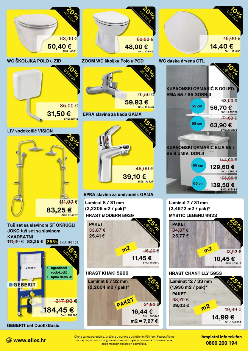 10 % ušteda 35 , 00 € 31 , 50 € sku : 22715 liv v odoko t lić vision 20 % ušteda zoom wc š koljka polo u pod 15 % ušteda 70 , 50 € 59 , 93 € sku : 153426 epra s la v ina z a kad u gama 10 % ušteda wc da s ka d rv ena gtl 20 % ušteda 25 % ušteda 63 , 00 € 50 , 40 € sku : 143311 83 , 25 € 25 % 111 , 00 € sku : 196453 mystic legend 9923 hrast chantilly 5953 13 , 93 € 10 , 45 € sku : 209218 m 2 lamina t 7 / 31 mm ( 2 , 4672 m 2 / p ak )* 25 % ušteda 25 % ušteda 19 , 99 € 14 , 99 € sku : 242354 m 2 25 % ušteda 25 % ušteda 15 , 26 € 11 , 45 € sku : 209870 m 2 21 , 92 € 16 , 44 € sku : 256049 paket m 2 = 7 , 27 € joko tuš s e t s a s la v inom kvadratni 60 , 00 € 48 , 00 € sku : 108145 111 , 00 € 83 , 25 € sku : 254757 hrast khaki 5966 15 % ušteda 46 , 00 € 39 , 10 € sku : 153427 15 % ušteda 217 , 00 € 184 , 45 € sku : 257288 10 % ušteda 16 , 00 € 14 , 40 € sku : 191495 144 , 00 € 129 , 60 € sku : 239519 63 , 00 € 56 , 70 € sku : 239521 55 cm 55 cm 71 , 00 € 63 , 90 € sku : 232893 65 cm 155 , 00 € 139 , 50 € sku : 232485 65 cm besplatni info telefon 0800 200 194 cijene su maloprodajne, izražene u eurima s uključenim pdv-om. fotografije ne moraju u potpunosti odgovarati stvarnom izgledu proizvoda. ispričavamo se zbog mogućih tiskarskih pogrešaka. www.alles.hr wc školjka polo u zid t uš s e t s a s la v inom 5 f okrugli lamina t 8 / 31 mm ( 2 , 2205 m 2 / p ak )* hrast modern 5939 epra s la v ina z a u mi v aonik gama geberit s e t d u ofi x ba s ic u g r adbeni v odoko t lić t i p ka del t a 01 kupaonski ormarić ema 55 / 65 s umiv . donji kupaonski ormarić s ogled . ema 55 / 65 gornji lamina t 8 / 32 mm ( 2 , 2604 m 2 / p ak )* lamina t 12 / 33 mm ( 1 , 936 m 2 / p ak )* paket 33 , 87 € 25 , 41 € paket 34 , 37 € 25 , 77 € paket 38 , 70 € 29 , 03 €