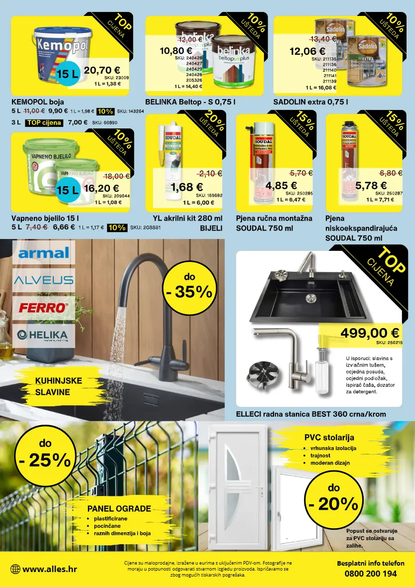 vr h u n s ka i z olacija tr ajno st mode r an di z ajn - 25 % do Po pust s e o stv a ru je z a PVC st ola r ij u s a z alihe . - 20 % do 20 , 70 € SKU : 23009 1 L = 1 , 38 € 15 L 5 L 11 , 00 € 10 % SKU : 66890 7 , 00 € 12 , 00 € 10 , 80 € SKU : 240428 240427 240429 240426 205326 1 L = 14 , 40 € 10 % UŠTEDA 13 , 40 € 12 , 06 € SKU : 211135 211136 211140 211141 211139 1 L = 16 , 08 € 10 % UŠTEDA 10 % UŠTEDA BELINKA Bel t o p - S 0 , 75 l SADOLIN e xtr a 0 , 75 l 18 , 00 € 16 , 20 € SKU : 209044 1 L = 1 , 08 € 15 L 5 L 7 , 40 € 10 % 20 % UŠTEDA 15 % UŠTEDA 15 % UŠTEDA 2 , 10 € 1 , 68 € SKU : 169682 1 L = 6 , 00 € 5 , 70 € 4 , 85 € SKU : 250285 1 L = 6 , 47 € 6 , 80 € 5 , 78 € SKU : 250287 1 L = 7 , 71 € Pjena ni s koek sp andi r aj u ća SOUDAL 750 ml TOP CIJENA 499 , 00 € SKU : 256215 - 35 % do PANEL OGRADE p la st ifici r ane p ocinčane r a z nih dimen z ija i boja PVC st ola r ija KEMOPOL boja 9 , 90 € SKU : 143264 3 L TOP cijena 1 L = 1 , 98 € Va p neno bjelilo 15 l 6 , 66 € SKU : 208861 1 L = 1 , 17 € YL ak r ilni ki t 280 ml BIJELI Pjena ru čna mon t a ž na SOUDAL 750 ml ELLECI r adna st anica BEST 360 c r na / k r om U i sp o ru ci : s la v ina s i zv lačnim tuš em , ocjedna p o su da , ocjedni p odlo ž ak , i sp i r ač ča š a , do z a t o r z a de t e r gen t. KUHINJSKE SLAVINE Besplatni info telefon 0800 200 194 Cijene su maloprodajne, izražene u eurima s uključenim PDV-om. Fotografije ne moraju u potpunosti odgovarati stvarnom izgledu proizvoda. Ispričavamo se zbog mogućih tiskarskih pogrešaka. www.alles.hr TOP CIJENA