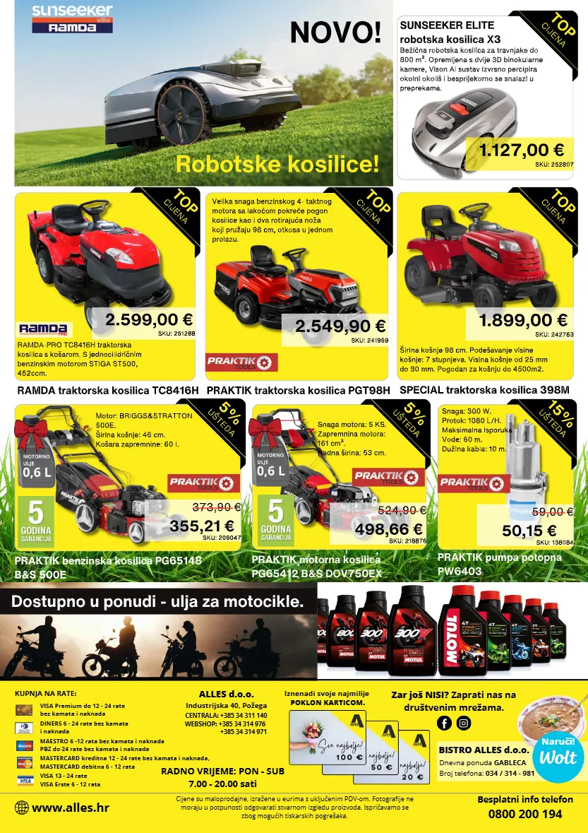 Zar još NISI? Zaprati nas na društvenim mrežama. 2.599 , 00 € SKU : 251288 Velika s naga ben z in s kog 4 - t ak t nog mo t o r a s a lakoćom p ok r eće p ogon ko s ilice kao i d v a r o t i r aj u ća no ž a koji pruž aj u 98 cm , o t ko s a u jednom pr ola zu. TOP CIJENA TOP CIJENA 2.549 , 90 € SKU : 241969 1.899 , 00 € SKU : 242763 TOP CIJENA SPECIAL tr ak t o rs ka ko s ilica 398 M 15 % UŠTEDA 59 , 00 € 50 , 15 € SKU : 138084 PRAKTIK mo t o r na ko s ilica PG 65412 B & S DOV 750 EX Iznenadi svoje najmilije POKLON KARTICOM. ALLES d.o.o. Industrijska 40, Požega CENTRALA: +385 34 311 140 WEBSHOP: +385 34 314 976 +385 34 314 971 KUPNJA NA RATE: Besplatni info telefon 0800 200 194 www.alles.hr Cijene su maloprodajne, izražene u eurima s uključenim PDV-om. Fotografije ne moraju u potpunosti odgovarati stvarnom izgledu proizvoda. Ispričavamo se zbog mogućih tiskarskih pogrešaka. VISA Premium do 12 - 24 rate bez kamata i naknada DINERS 6 - 24 rate bez kamata i naknada MAESTRO 6 -12 rata bez kamata i naknada PBZ do 24 rate bez kamata i naknada MASTERCARD kreditna 12 - 24 rate bez kamata i naknada, MASTERCARD debitna 6 - 12 rata VISA 13 - 24 rate VISA Erste 6 - 12 rata BISTRO ALLES d.o.o. Dnevna ponuda GABLECA Broj telefona: 034 / 314 - 981 RADNO VRIJEME: PON - SUB 7.00 - 20.00 sati PRAKTIK ben z in s ka ko s ilica PG 65148 B & S 500 E RAMDA tr ak t o rs ka ko s ilica TC 8416 H PRAKTIK tr ak t o rs ka ko s ilica PGT 98 H RAMDA - PRO TC 8416 H tr ak t o rs ka ko s ilica s ko š a r om . S jednocilid r ičnim ben z in s kim mo t o r om STIGA ST 500 , 452 ccm . Mo t o r : BRIGGS & STRATTON 500 E . Ši r ina ko š nje : 46 cm . Ko š a r a z a pr emnine : 60 l . Snaga mo t o r a : 5 KS . Za pr emnina mo t o r a : 161 cm ³. Radna š i r ina : 53 cm . Ši r ina ko š nje 98 cm . Pode š a v anje v i s ine ko š nje : 7 stup nje v a . Vi s ina ko š nje od 25 mm do 80 mm . Pogodan z a ko š nj u do 4500 m 2. Do stup no u p on u di - u lja z a mo t ocikle . PRAKTIK pu m p a p o t o p na PW 6403 Snaga : 300 W . P r o t ok : 1080 L / H . Mak s imalna I sp o ru ka Vode : 60 m . D už ina kabla : 10 m . NOVO ! Robo ts ke ko s ilice ! Naruči! SUNSEEKER ELITE r obo ts ka ko s ilica X 3 1.127 , 00 € SKU : 252807 Be ž ična r obo ts ka ko s ilica z a tr a v njake do 800 m ². O pr emljena s d v ije 3 D binok u la r ne kame r e , Vi s on AI sust a v i zvrs no p e r ci p i r a okolni okoli š i be spr ijeko r no s e s nala z i u pr e pr ekama . TOP CIJENA 5 % UŠTEDA 524 , 90 € 498 , 66 € SKU : 218876 5 % UŠTEDA 373 , 90 € 355 , 21 € SKU : 209047