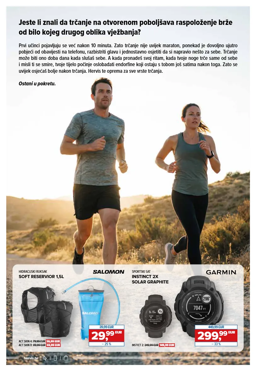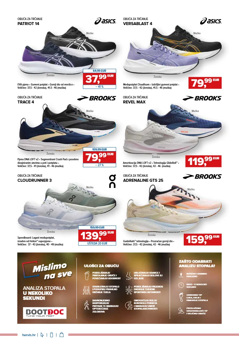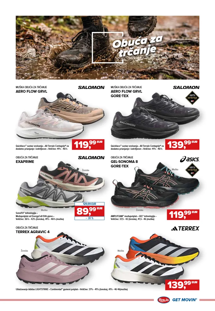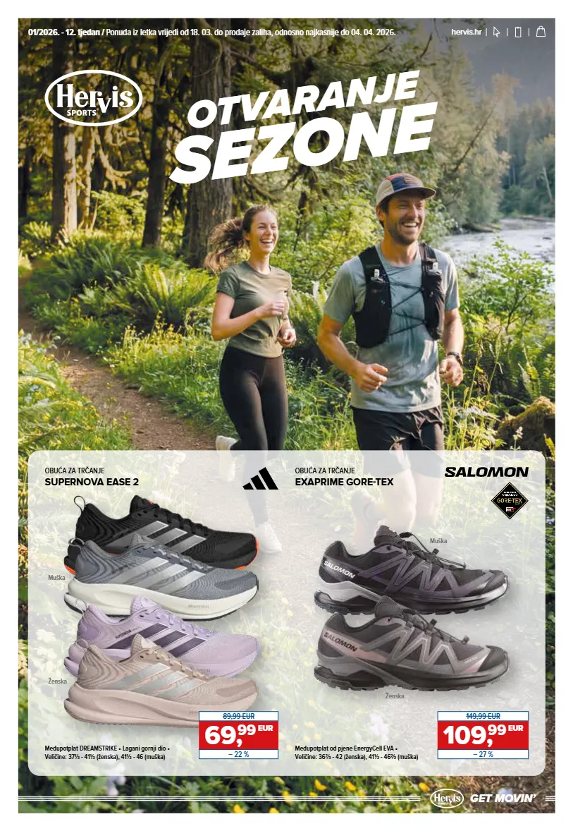 GET MOVINʼ GET MOVINʼ 01/2026. - 12. tjedan / Ponuda iz letka vrijedi od 18. 03. do prodaje zaliha, odnosno najkasnije do 04. 04. 2026. hervis.hr Međupotplat DREAMSTRIKE • Lagani gornji dio • Veličine: 37⅓ - 41⅓ (ženska), 41⅓ - 46 (muška) OBUĆA ZA TRČANJE SUPERNOVA EASE 2 OTVARANJE SEZONE OBUĆA ZA TRČANJE EXAPRIME GORE-TEX Međupotplat od pjene EnergyCell EVA • Veličine: 36⅔ - 42 (ženska), 41⅓ - 46⅔ (muška) 69, 99 EUR 89,99 EUR – 22 % 109, 99 EUR 149,99 EUR – 27 % Muška Ženska Muška Ženska