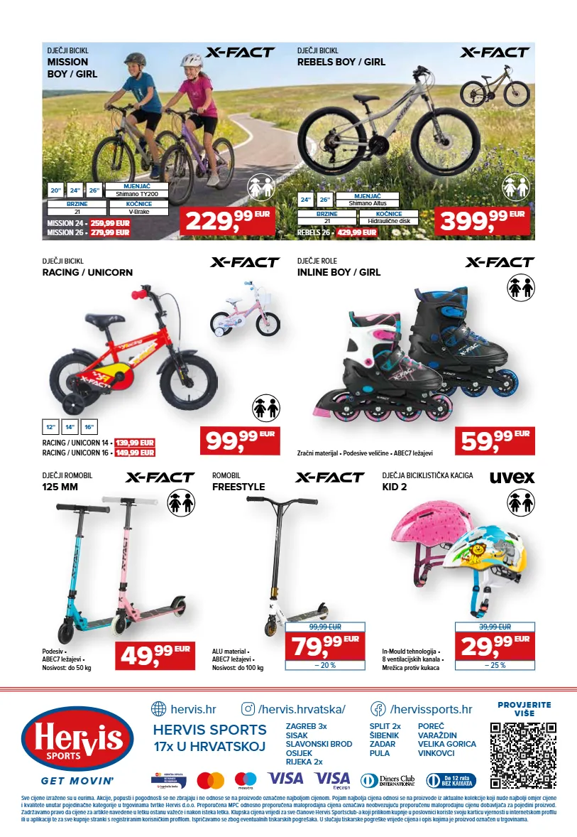 g e t m o v i n’ hervis sports 17x u hrvatskoj hervis.hr /hervissports.hr /hervis.hrvatska/ sve cijene izražene su u eurima. akcije, popusti i pogodnosti se ne zbrajaju i ne odnose se na proizvode označene najboljom cijenom. pojam najbolja cijena odnosi se na proizvode iz aktualne kolekcije koji nude najbolji omjer cijene i kvalitete unutar pojedinačne kategorije u trgovinama tvrtke hervis d.o.o. preporučena mpc odnosno preporučena maloprodajna cijena označava neobvezujuću preporučenu maloprodajnu cijenu dobavljača za pojedini proizvod. zadržavamo pravo da cijene za artikle navedene u letku ostanu važeće i nakon isteka letka. klupska cijena vrijedi za sve članove hervis sportsclub-a koji prilikom kupnje u poslovnici koriste svoju karticu vjernosti u internetskom profilu ili u aplikaciji te za sve kupnje stranki s registriranim korisničkim profilom. ispričavamo se zbog eventualnih tiskarskih pogrešaka. u slučaju tiskarske pogreške vrijede cijena i opis kojima je proizvod označen u trgovinama. zagreb 3x sisak slavonski brod osijek rijeka 2x split 2x šibenik zadar pula poreč varaždin velika gorica vinkovci provjerite više podesiv • abec7 ležajevi • nosivost: do 50 kg in-mould tehnologija • 8 ventilacijskih kanala • mrežica protiv kukaca dječji bicikl rebels boy / girl 399, 99 eur dječji bicikl racing / unicorn 99, 99 eur dječji romobil 125 mm 49, 99 eur romobil freestyle dječja biciklistička kaciga kid 2 dječje role inline boy / girl 59, 99 eur 79, 99 eur 99,99 eur – 20 % alu material • abec7 ležajevi • nosivost: do 100 kg 29, 99 eur 39,99 eur – 25 % racing / unicorn 14 • 139,99 eur racing / unicorn 16 • 149,99 eur 16'' 14'' 12'' kočnice hidraulične disk brzine 21 26'' mjenjač shimano altus 24'' rebels 26 • 429,99 eur dječji bicikl mission boy / girl 229, 99 eur kočnice v-brake brzine 21 20'' 26'' mjenjač shimano ty200 24'' mission 24 • 259,99 eur mission 26 • 279,99 eur zračni materijal • podesive veličine • abec7 ležajevi