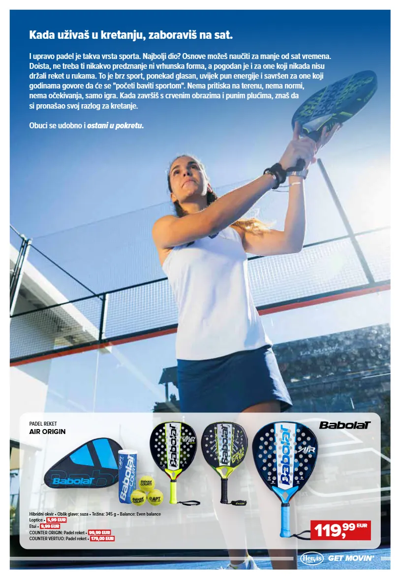 GET MOVINʼ Kada uživaš u kretanju, zaboraviš na sat. I upravo padel je takva vrsta sporta. Najbolji dio? Osnove možeš naučiti za manje od sat vremena. Doista, ne treba ti nikakvo predznanje ni vrhunska forma, a pogodan je i za one koji nikada nisu držali reket u rukama. To je brz sport, ponekad glasan, uvijek pun energije i savršen za one koji godinama govore da će se "početi baviti sportom". Nema pritiska na terenu, nema normi, nema očekivanja, samo igra. Kada završiš s crvenim obrazima i punim plućima, znaš da si pronašao svoj razlog za kretanje. Obuci se udobno i ostani u pokretu. PADEL REKET AIR ORIGIN 119, 99 EUR Hibridni okvir • Oblik glave: suza • Težina: 345 g • Balance: Even balance Loptice • 5,99 EUR Etui • 9,99 EUR COUNTER ORIGIN: Padel reket • 99,99 EUR COUNTER VERTUO: Padel reket • 179,00 EUR