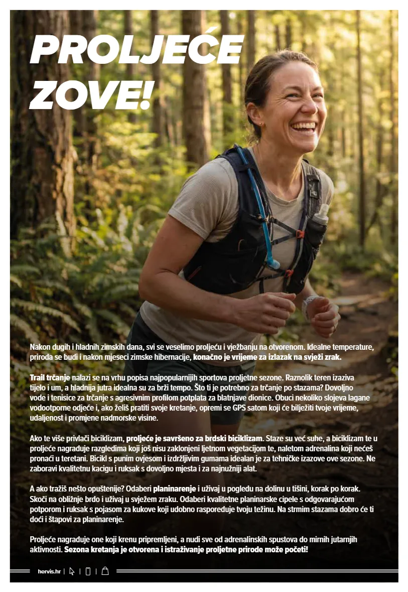hervis.hr nakon dugih i hladnih zimskih dana, svi se veselimo proljeću i vježbanju na otvorenom. idealne temperature, priroda se budi i nakon mjeseci zimske hibernacije, konačno je vrijeme za izlazak na svježi zrak. trail trčanje nalazi se na vrhu popisa najpopularnijih sportova proljetne sezone. raznolik teren izaziva tijelo i um, a hladnija jutra idealna su za brži tempo. što ti je potrebno za trčanje po stazama? dovoljno vode i tenisice za trčanje s agresivnim profilom potplata za blatnjave dionice. obuci nekoliko slojeva lagane vodootporne odjeće i, ako želiš pratiti svoje kretanje, opremi se gps satom koji će bilježiti tvoje vrijeme, udaljenost i promjene nadmorske visine. ako te više privlači biciklizam, proljeće je savršeno za brdski biciklizam . staze su već suhe, a biciklizam te u proljeće nagrađuje razgledima koji još nisu zaklonjeni ljetnom vegetacijom te, naletom adrenalina koji nećeš pronaći u teretani. bicikl s punim ovjesom i izdržljivim gumama idealan je za tehničke izazove ove sezone. ne zaboravi kvalitetnu kacigu i ruksak s dovoljno mjesta i za najnužniji alat. a ako tražiš nešto opuštenije? odaberi planinarenje i uživaj u pogledu na dolinu u tišini, korak po korak. skoči na obližnje brdo i uživaj u svježem zraku. odaberi kvalitetne planinarske cipele s odgovarajućom potporom i ruksak s pojasom za kukove koji udobno raspoređuje tvoju težinu. na strmim stazama dobro će ti doći i štapovi za planinarenje. proljeće nagrađuje one koji krenu pripremljeni, a nudi sve od adrenalinskih spustova do mirnih jutarnjih aktivnosti. sezona kretanja je otvorena i istraživanje proljetne prirode može početi! proljeće zove!