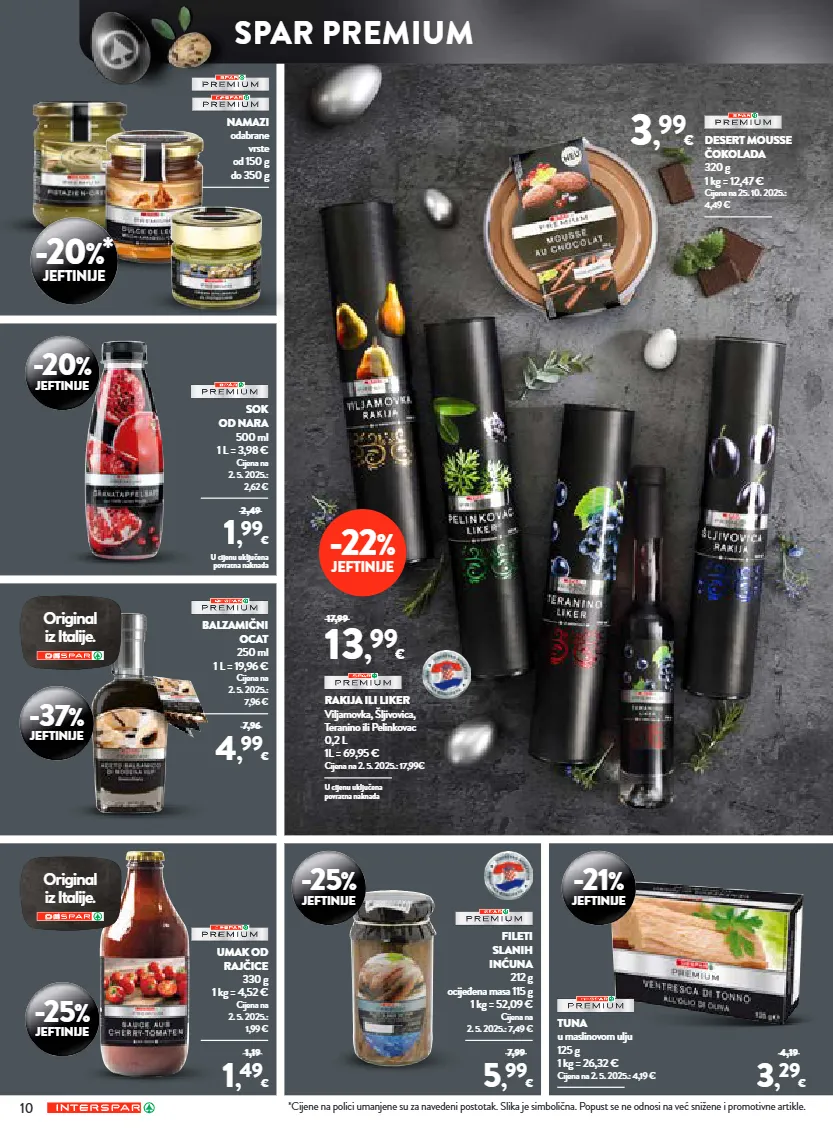 10 namazi odabrane vrste od 150 g do 350 g *cijene na polici umanjene su za navedeni postotak. slika je simbolična. popust se ne odnosi na već sniđene i promotivne artikle. -22 % jeftinije -20 % jeftinije -37 % jeftinije -25 % jeftinije -25 % jeftinije -21 % jeftinije sok od nara 500 ml 1 l = 3,98 € cijena na 2. 5. 2025.: 2,62 € 1 , 99 € 2,49 balzamični ocat 250 ml 1 l = 19,96 € cijena na 2. 5. 2025.: 7,96 € 4 , 99 € 7,96 umak od rajčice 330 g 1 kg = 4,52 € cijena na 2. 5. 2025.: 1,99 € 1 , 49 € 1,19 fileti slanih inćuna 212 g ocijeđena masa 115 g 1 kg = 52,09 € cijena na 2. 5. 2025.: 7,49 € 5 , 99 € 7,99 tuna u maslinovom ulju 125 g 1 kg = 26,32 € cijena na 2. 5. 2025.: 4,19 € 3 , 29 € 4,19 -20 %* jeftinije u cijenu uključena povratna naknada desert mousse čokolada 320 g 1 kg = 12,47 € cijena na 25. 10. 2025.: 4,49 € 3 , 99 € u cijenu uključena povratna naknada rakija ili liker viljamovka, šljivovica, teranino ili pelinkovac 0,2 l 1l = 69,95 € cijena na 2. 5. 2025.: 17,99€ 13 , 99 € 17,99 spar premium original iz italije. original iz italije.