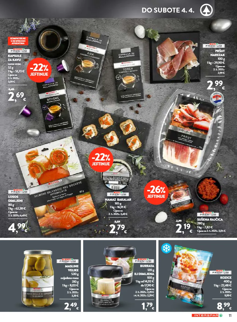 11 -26 % jeftinije -22 % jeftinije -22 % jeftinije masline velike 530 g ocijeđena masa 310 g 1 kg = 8,03 € cijena na 2. 5. 2025.: 3,39 € 2 , 49 € burrata 120 g ili dimljena 100 g 1 kg od 14,92 € do 17,90 € cijena na 2. 5. 2025.: 2,29 € i 4. 11. 2025.: 2,29 € 1 , 79 € kozice 400 g 1 kg = 22,48 € cijena na 2. 5. 2025.: 9,99 € 8 , 99 € pršut narezak 100 g 1 kg = 29,90 € cijena na 2. 5. 2025.: 2,99 € 2 , 99 € namaz bakalar 165 g 1 kg = 16,91 € cijena na 2. 5. 2025.: 3,49 € 2 , 79 € 3,59 losos dimljeni 80 g 1 kg = 62,38 € cijena na 2. 5. 2025.: 6,49 € 4 , 99 € sušena rajčica 280 g 1 kg = 7,82 € cijena na 2. 5. 2025.: 3,05 € 2 , 19 € 2,99 kapsule za kavu razne vrste 52 g 1 kg = 51,73 € cijena na 2. 5. 2025.: 3,09 € 2 , 69 € 3,49 kompatiblne s nespresso aparatima do subote 4. 4.