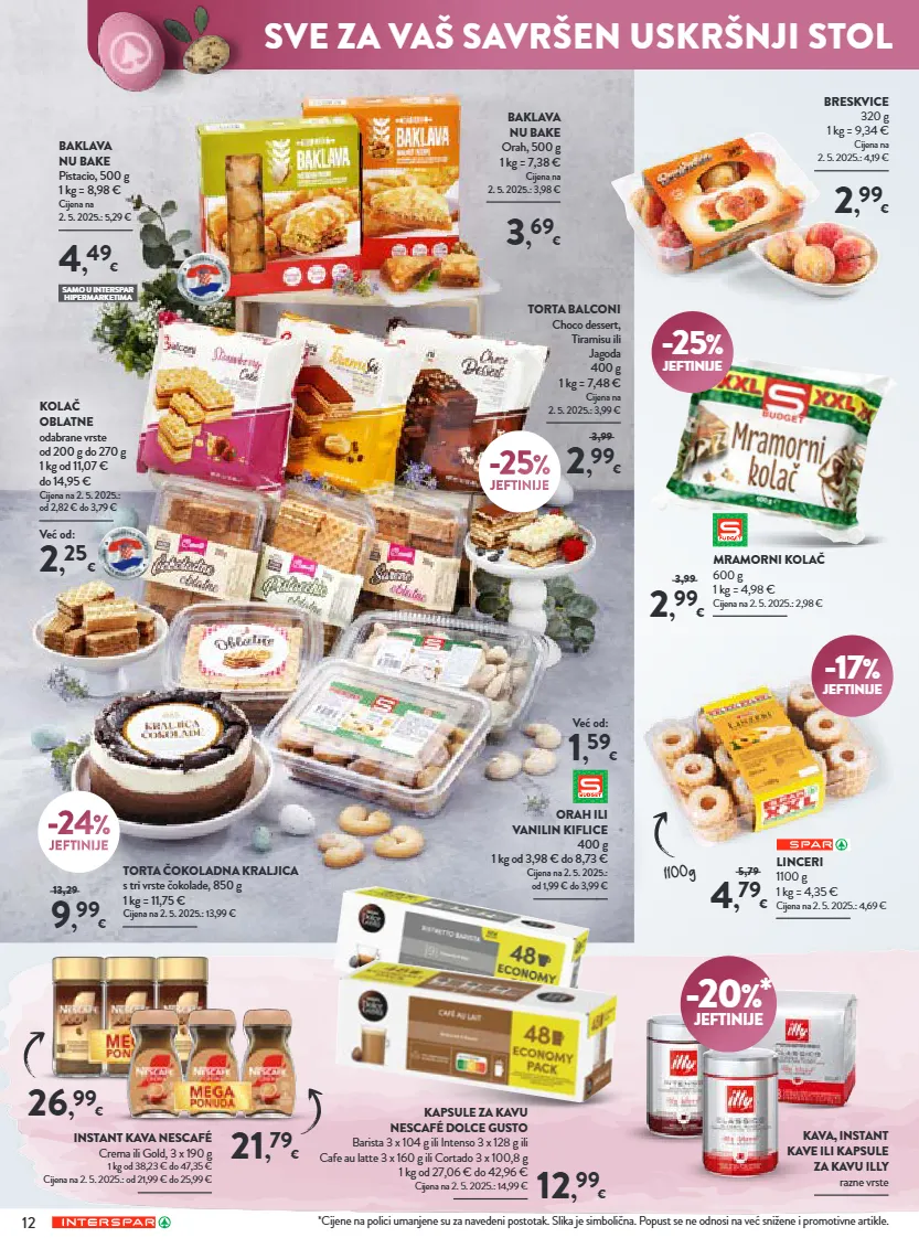 12 1100g *cijene na polici umanjene su za navedeni postotak. slika je simbolična. popust se ne odnosi na već snižene i promotivne artikle. kava, instant kave ili kapsule za kavu illy razne vrste 3 , 69 € baklava nu bake orah, 500 g 1 kg = 7,38 € cijena na 2. 5. 2025.: 3,98 € torta čokoladna kraljica s tri vrste čokolade, 850 g 1 kg = 11,75 € cijena na 2. 5. 2025.: 13,99 € 9 , 99 € 13,29 2 , 99 € torta balconi choco dessert, tiramisu ili jagoda 400 g 1 kg = 7,48 € cijena na 2. 5. 2025.: 3,99 € 3,99 2 , 99 € breskvice 320 g 1 kg = 9,34 € cijena na 2. 5. 2025.: 4,19 € mramorni kolač 600 g 1 kg = 4,98 € cijena na 2. 5. 2025.: 2,98 € 2 , 99 € 3,99 linceri 1100 g 1 kg = 4,35 € cijena na 2. 5. 2025.: 4,69 € 4 , 79 € 5,79 -24 % jeftinije -25 % jeftinije 4 , 49 € baklava nu bake pistacio, 500 g 1 kg = 8,98 € cijena na 2. 5. 2025.: 5,29 € 2 , 25 € kolač oblatne odabrane vrste od 200 g do 270 g 1 kg od 11,07 € do 14,95 € cijena na 2. 5. 2025.: od 2,82 € do 3,79 € već od: 12 , 99 € kapsule za kavu nescafé dolce gusto barista 3 x 104 g ili intenso 3 x 128 g ili cafe au latte 3 x 160 g ili cortado 3 x 100,8 g 1 kg od 27,06 € do 42,96 € cijena na 2. 5. 2025.: 14,99 € 21 , 79 € 26 , 99 € instant kava nescafé crema ili gold, 3 x 190 g 1 kg od 38,23 € do 47,35 € cijena na 2. 5. 2025.: od 21,99 € do 25,99 € -20 %* jeftinije orah ili vanilin kiflice 400 g 1 kg od 3,98 € do 8,73 € cijena na 2. 5. 2025.: od 1,99 € do 3,99 € 1 , 59 € već od: -25 % jeftinije -17 % jeftinije samo u interspar hipermarketima sve za vaš savršen uskršnji stol