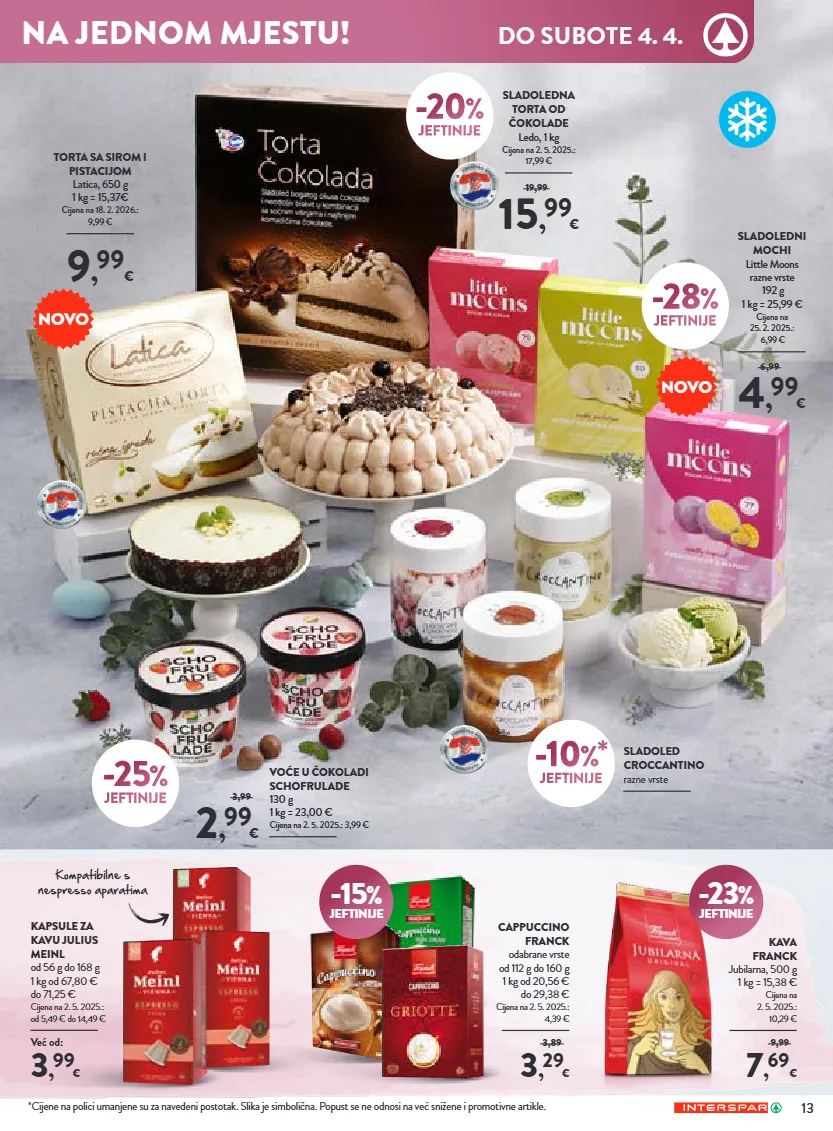 13 *cijene na polici umanjene su za navedeni postotak. slika je simbolična. popust se ne odnosi na već sniđene i promotivne artikle. -15 % jeftinije -23 % jeftinije 3 , 29 € cappuccino franck odabrane vrste od 112 g do 160 g 1 kg od 20,56 € do 29,38 € cijena na 2. 5. 2025.: 4,39 € 3,89 7 , 69 € kava franck jubilarna, 500 g 1 kg = 15,38 € cijena na 2. 5. 2025.: 10,29 € 9,99 3 , 99 € kapsule za kavu julius meinl od 56 g do 168 g 1 kg od 67,80 € do 71,25 € cijena na 2. 5. 2025.: od 5,49 € do 14,49 € već od: sladoledna torta od čokolade ledo, 1 kg cijena na 2. 5. 2025.: 17,99 € 15 , 99 € 19,99 -20 % jeftinije torta sa sirom i pistacijom latica, 650 g 1 kg = 15,37€ cijena na 18. 2. 2026.: 9,99 € 9 , 99 € -28 % jeftinije voće u čokoladi schofrulade 130 g 1 kg = 23,00 € cijena na 2. 5. 2025.: 3,99 € 2 , 99 € 3,99 -25 % jeftinije sladoled croccantino razne vrste -10 %* jeftinije sladoledni mochi little moons razne vrste 192 g 1 kg = 25,99 € cijena na 25. 2. 2025.: 6,99 € 4 , 99 € 6,99 kompatibilne s nespresso aparatima novo novo na jednom mjestu! do subote 4. 4.