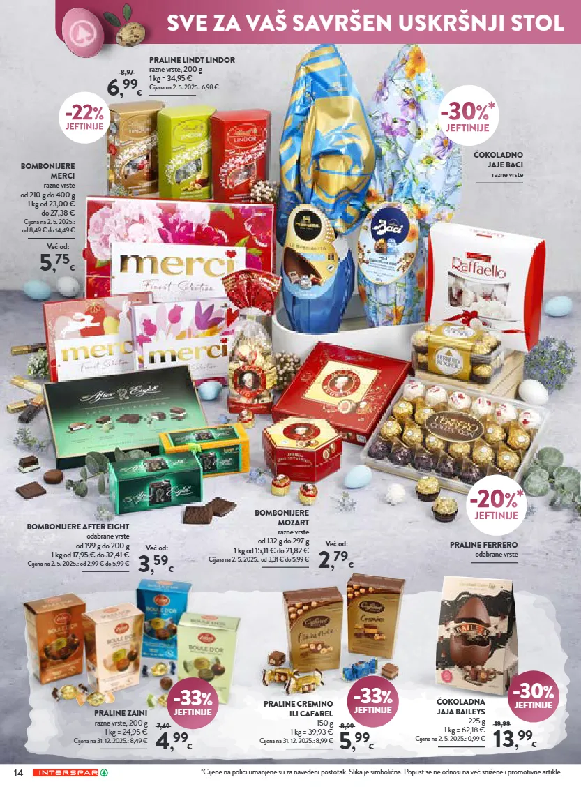 14 *cijene na polici umanjene su za navedeni postotak. slika je simbolična. popust se ne odnosi na već sniđene i promotivne artikle. -33 % jeftinije 4 , 99 € praline zaini razne vrste, 200 g 1 kg = 24,95 € cijena na 31. 12. 2025.: 8,49 € 7,49 -33 % jeftinije 5 , 99 € praline cremino ili cafarel 150 g 1 kg = 39,93 € cijena na 31. 12. 2025.: 8,99 € 8,99 -30 % jeftinije 13 , 99 € čokoladna jaja baileys 225 g 1 kg = 62,18 € cijena na 2. 5. 2025.: 0,99 € 19,99 čokoladno jaje baci razne vrste 6 , 99 € praline lindt lindor razne vrste, 200 g 1 kg = 34,95 € cijena na 2. 5. 2025.: 6,98 € 8,97 -22 % jeftinije 5 , 75 € već od: 2 , 79 € već od: 3 , 59 € već od: praline ferrero odabrane vrste -20 %* jeftinije -30 %* jeftinije bombonijere merci razne vrste od 210 g do 400 g 1 kg od 23,00 € do 27,38 € cijena na 2. 5. 2025.: od 8,49 € do 14,49 € bombonijere mozart razne vrste od 132 g do 297 g 1 kg od 15,11 € do 21,82 € cijena na 2. 5. 2025.: od 3,31 € do 5,99 € bombonijere after eight odabrane vrste od 199 g do 200 g 1 kg od 17,95 € do 32,41 € cijena na 2. 5. 2025.: od 2,99 € do 5,99 € sve za vaš savršen u skršnji stol na