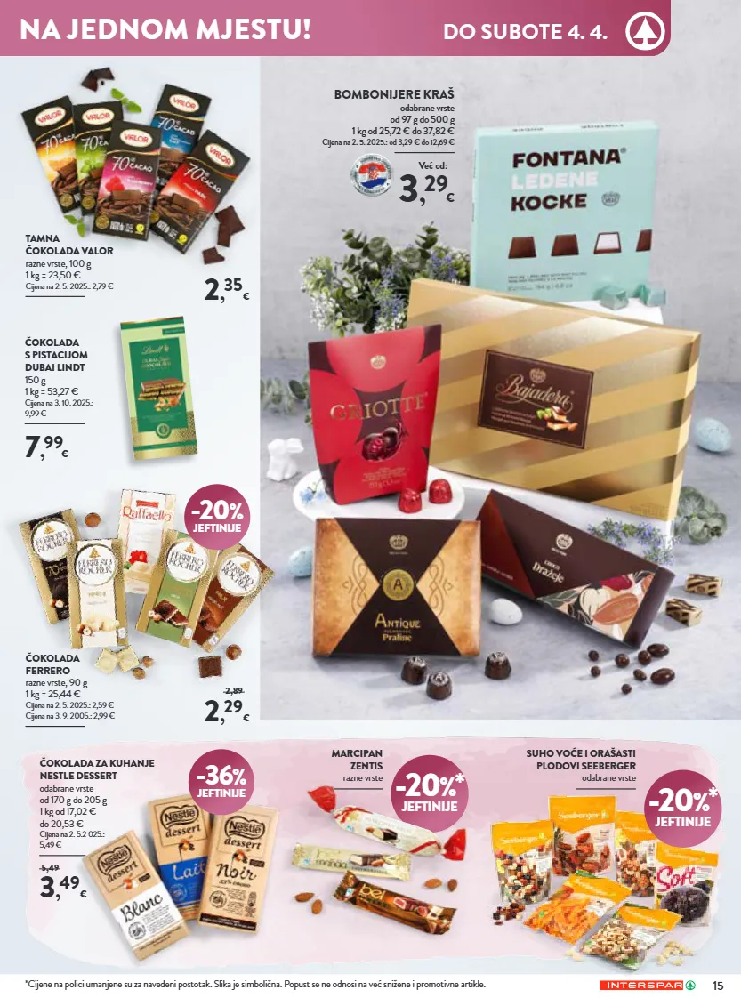 15 ČOKOLADA ZA KUHANJE NESTLE DESSERT odabrane vrste od 170 g do 205 g 1 kg od 17,02 € do 20,53 € Cijena na 2. 5.2 025.: 5,49 € *Cijene na polici umanjene su za navedeni postotak. Slika je simbolična. Popust se ne odnosi na već snižene i promotivne artikle. MARCIPAN ZENTIS razne vrste SUHO VOĆE I ORAŠASTI PLODOVI SEEBERGER odabrane vrste 2 , 35 € TAMNA ČOKOLADA VALOR razne vrste, 100 g 1 kg = 23,50 € Cijena na 2. 5. 2025.: 2,79 € ČOKOLADA FERRERO razne vrste, 90 g 1 kg = 25,44 € Cijena na 2. 5. 2025.: 2,59 € Cijena na 3. 9. 2005.: 2,99 € 2 , 29 € 2,89 3 , 49 € 5,49 -20 % JEFTINIJE -36 % JEFTINIJE 7 , 99 € ČOKOLADA S PISTACIJOM DUBAI LINDT 150 g 1 kg = 53,27 € Cijena na 3. 10. 2025.: 9,99 € -20 %* JEFTINIJE 3 , 29 € Već od: BOMBONIJERE KRAŠ odabrane vrste od 97 g do 500 g 1 kg od 25,72 € do 37,82 € Cijena na 2. 5. 2025.: od 3,29 € do 12,69 € -20 %* JEFTINIJE NA JEDNOM MJESTU! DO SUBOTE 4. 4.