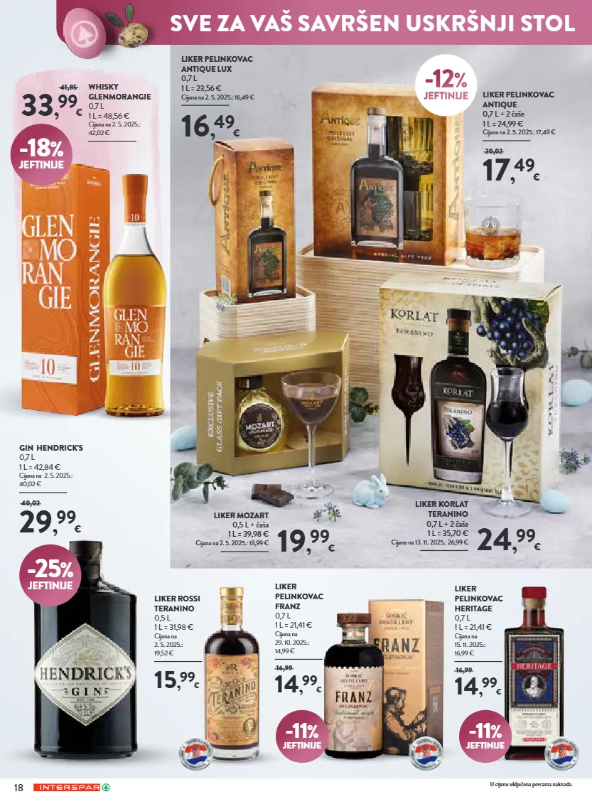 18 u cijenu uključena povratna naknada. liker rossi teranino 0,5 l 1 l = 31,98 € cijena na 2. 5. 2025.: 19,52 € 15 , 99 € -11 % jeftinije -11 % jeftinije liker pelinkovac heritage 0,7 l 1 l = 21,41 € cijena na 15. 11. 2025.: 16,99 € 14 , 99 € 16,99 liker pelinkovac franz 0,7 l 1 l = 21,41 € cijena na 29. 10. 2025.: 14,99 € 14 , 99 € 16,99 whisky glenmorangie 0,7 l 1 l = 48,56 € cijena na 2. 5. 2025.: 42,02 € 33 , 99 € 41,85 gin hendrick’s 0,7 l 1 l = 42,84 € cijena na 2. 5. 2025.: 40,02 € 29 , 99 € 40,02 -25 % jeftinije liker pelinkovac antique 0,7 l + 2 čaše 1 l = 24,99 € cijena na 2. 5. 2025.: 17,49 € 17 , 49 € 20,02 -12 % jeftinije 16 , 49 € liker pelinkovac antique lux 0,7 l 1 l = 23,56 € cijena na 2. 5. 2025.: 16,49 € liker korlat teranino 0,7 l + 2 čaše 1 l = 35,70 € cijena na 13. 11. 2025.: 26,99 € 24 , 99 € 19 , 99 € liker mozart 0,5 l + čaša 1 l = 39,98 € cijena na 2. 5. 2025.: 18,99 € -18 % jeftinije sve za vaš savršen uskršnji stol