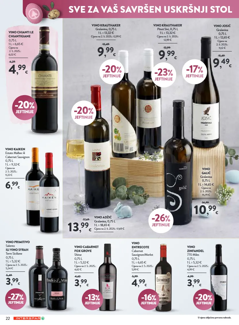 22 vino cabarnet fox grove shiraz 0,75 l 1 l = 5,32 € cijena na 2. 5. 2025.: 4,62 € 3 , 99 € 4,62 -16 % jeftinije vino entrecote cabernet sauvignon/merlot 0,75 l 1 l = 6,65 € cijena na 2. 5. 2025.: 5,99 € 4 , 99 € 5,99 -20 % jeftinije vino zinfandel 770 miles 0,75 l 1 l = 5,32 € cijena na 2. 5. 2025.: 4,99 € 3 , 99 € 4,99 -20 % jeftinije vino chianti le chiantigiane 0,75 l 1 l = 6,65 € cijena na 2. 5. 2025.: 6,02 € 4 , 99 € 6,29 vino josić graševina 0,75 l 1 l = 12,65 € cijena na 2. 5. 2025.: 11,12 € 9 , 49 € 11,49 -17 % jeftinije vino krauthaker graševina, 0,75 l 1 l = 13,32 € cijena na 2. 5. 2025.: 12,99 € 9 , 99 € 12,49 vino krauthaker pinot sivi, 0,75 l 1 l = 13,32 € cijena na 2. 5. 2025.: 12,99 € 9 , 99 € 12,99 -20 % jeftinije -23 % jeftinije vino galić graševina 0,75 l 1 l = 14,65 € cijena na 2. 5. 2025.: 15,79 € 10 , 99 € 14,99 -26 % jeftinije vino adžić graševina, 0,75 l 1 l = 18,65 € cijena na 2. 5. 2025.: 17,69 € 13 , 99 € 17,69 -20 % jeftinije u cijenu uključena povratna naknada. -13 % jeftinije -27 % jeftinije vino primitivo salento ili vino syrah terre siciliane 0,75 l 1 l = 5,32 € cijena na 2. 5. 2025.: 5,34 € 3 , 99 € 5,49 vino kaiken estate malbec ili cabernet sauvignon 0,75 l 1 l = 9,32 € cijena na 2. 5. 2025.: 9,22 € 6 , 99 € sve za vaš savršen uskršnji stol