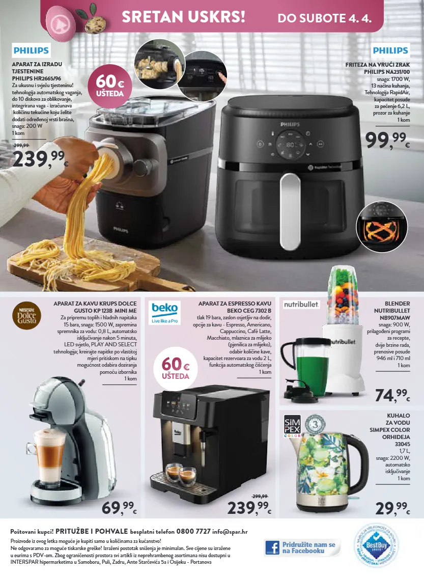 aparat za espresso kavu beko ceg 7302 b tlak 19 bara, zaslon osjetljiv na dodir, opcije za kavu - espresso, americano, cappuccino, café latte, macchiato, mlaznica za mlijeko (pjenilica za mlijeko), odabir količine kave, kapacitet rezervoara za vodu 2 l, funkcija automatskog čišćenja 1 kom friteza na vrući zrak philips na231/00 snaga: 1700 w, 13 načina kuhanja, tehnologija rapidair, kapacitet posude za pečenje 6,2 l, prozor za kuhanje 1 kom 99 , 99 € blender nutribullet nb907maw snaga: 900 w, prilagođeni programi za recepte, dvije brzine rada, prenosive posude 946 ml i 710 ml 1 kom kuhalo za vodu simpex color orhideja 33045 1,7 l, snaga: 2200 w, automatsko isključivanje 1 kom aparat za kavu krups dolce gusto kp 123b mini me za pripremu toplih i hladnih napitaka 15 bara, snaga: 1500 w, zapremina spremnika za vodu: 0,8 l, automatsko isključivanje nakon 5 minuta, led svjetlo, play and select tehnologija; kreirajte napitke po vlastitoj mjeri pritiskom na tipku mogućnost odabira doziranja pomoću izbornika 1 kom 60 € ušteda 29 , 99 € 74 , 99 € 239 , 99 € 299,99 69 , 99 € 60 € ušteda 239 , 99 € 299,99 aparat za izradu tjestenine philips hr2665/96 za ukusnu i svježu tjesteninu! tehnologija automatskog vaganja, do 10 diskova za oblikovanje, integrirana vaga - izračunava količinu tekućine koju želite dodati određenoj vrsti brašna, snaga: 200 w 1 kom pridružite nam se na facebooku poštovani kupci! pritužbe i pohvale besplatni telefon 0800 7727 info@spar.hr proizvode iz ovog letka moguće je kupiti samo u količinama za kućanstvo! ne odgovaramo za moguće tiskarske greške! izraženi postotak sniženja je minimalan. sve cijene su izražene u eurima s pdv-om. zbog ograničenosti prostora svi artikli iz neprehrambenog asortimana nisu dostupni u interspar hipermarketima u samoboru, puli, zadru, ante starčevića 5a i osijeku - portanova do subote 4. 4. sretan uskrs!