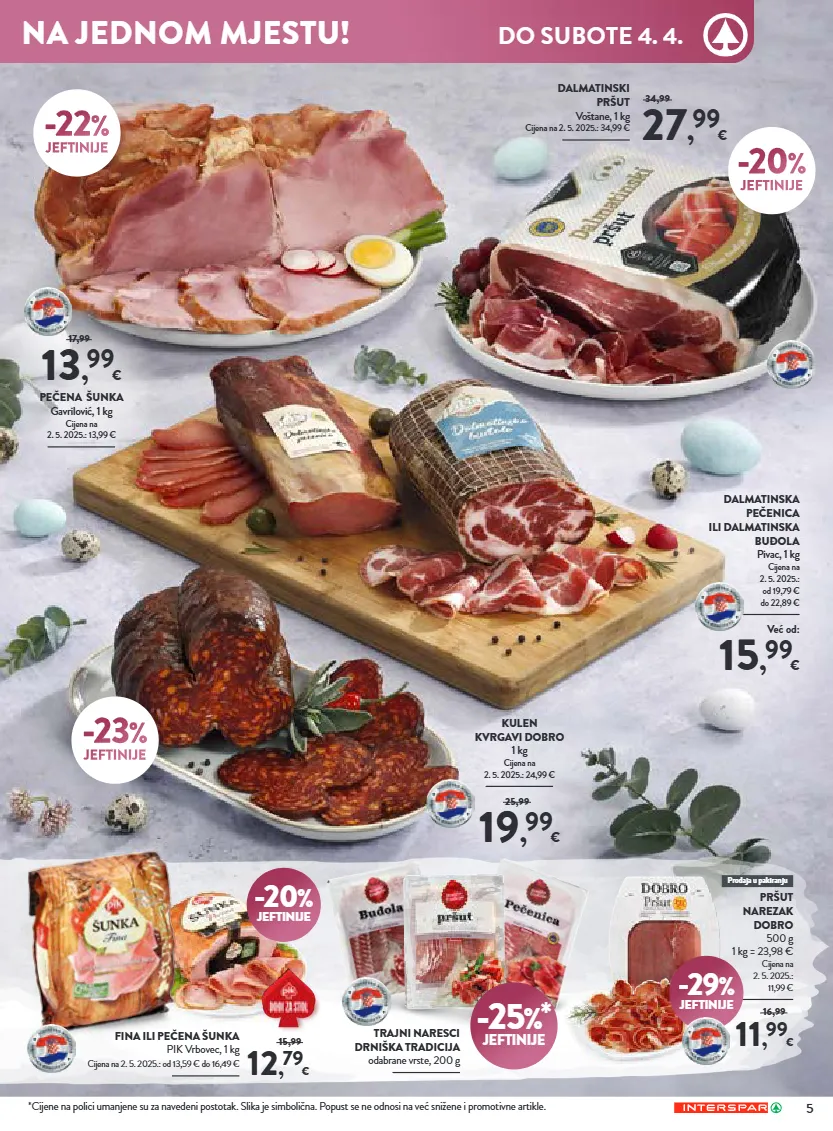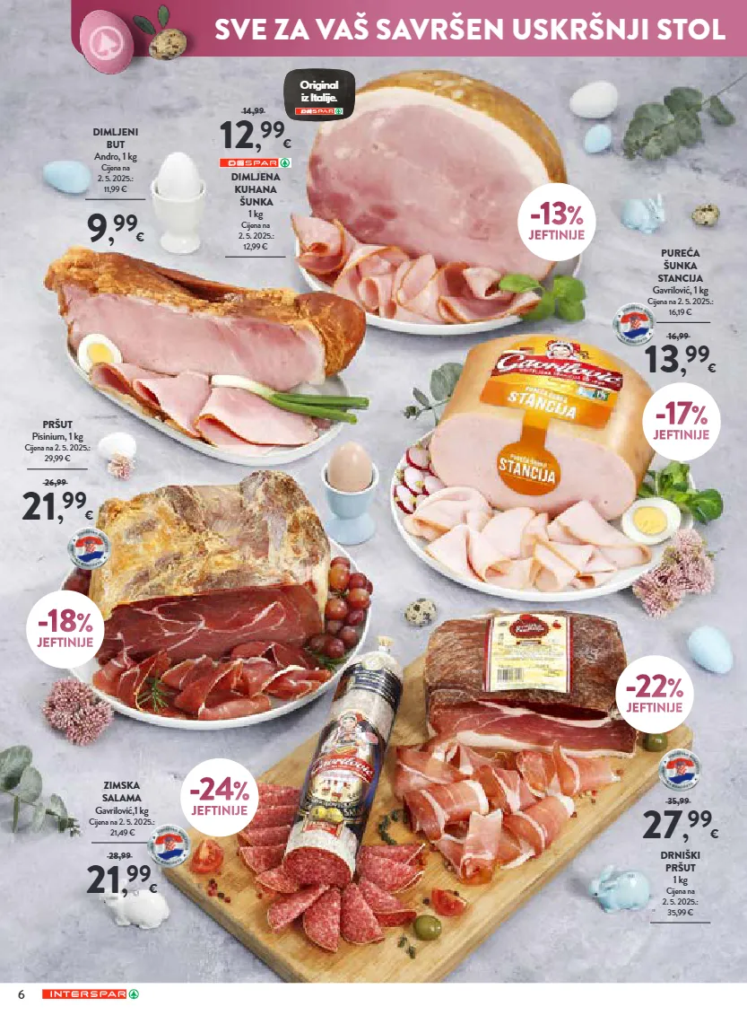 *cijene na polici umanjene su za navedeni postotak. slika je simbolična. popust se ne odnosi na već snižene i promotivne artikle. -15 % jeftinije papričice punjene sirom 140 g ocijeđena masa 100 g 1 kg = 27,90 € cijena na 24. 10. 2025.: 3,29 € 2 , 79 € 3,29 čajna kobasica ili kulenova seka gavrilović, 1 kg cijena na 2. 5. 2025.: od 17,49 € do 19,79 € 14 , 99 € -28 % jeftinije kuhana šunka premium gran bicotto rovagnati, 1 kg cijena na 27. 2. 2026.: 27,99 € 19 , 99 € 27,99 delikates paštete pašteta s pačjom i pilećom jetrom i pašteta s guščjom i pilećom jetrom 1 kg -30 %* jeftinije -20 % jeftinije domaća kobasica ravlić, 1 kg cijena na 2. 5. 2025.: 19,99 € 15 , 99 € domaći pršut delikates mijukić, 1 kg cijena na 2. 5. 2025.: 18,99 € 18 , 99 € 23,99 -25 %* jeftinije ajvar mama’s razne vrste 4 sve za vaš savršen uskršnji stol