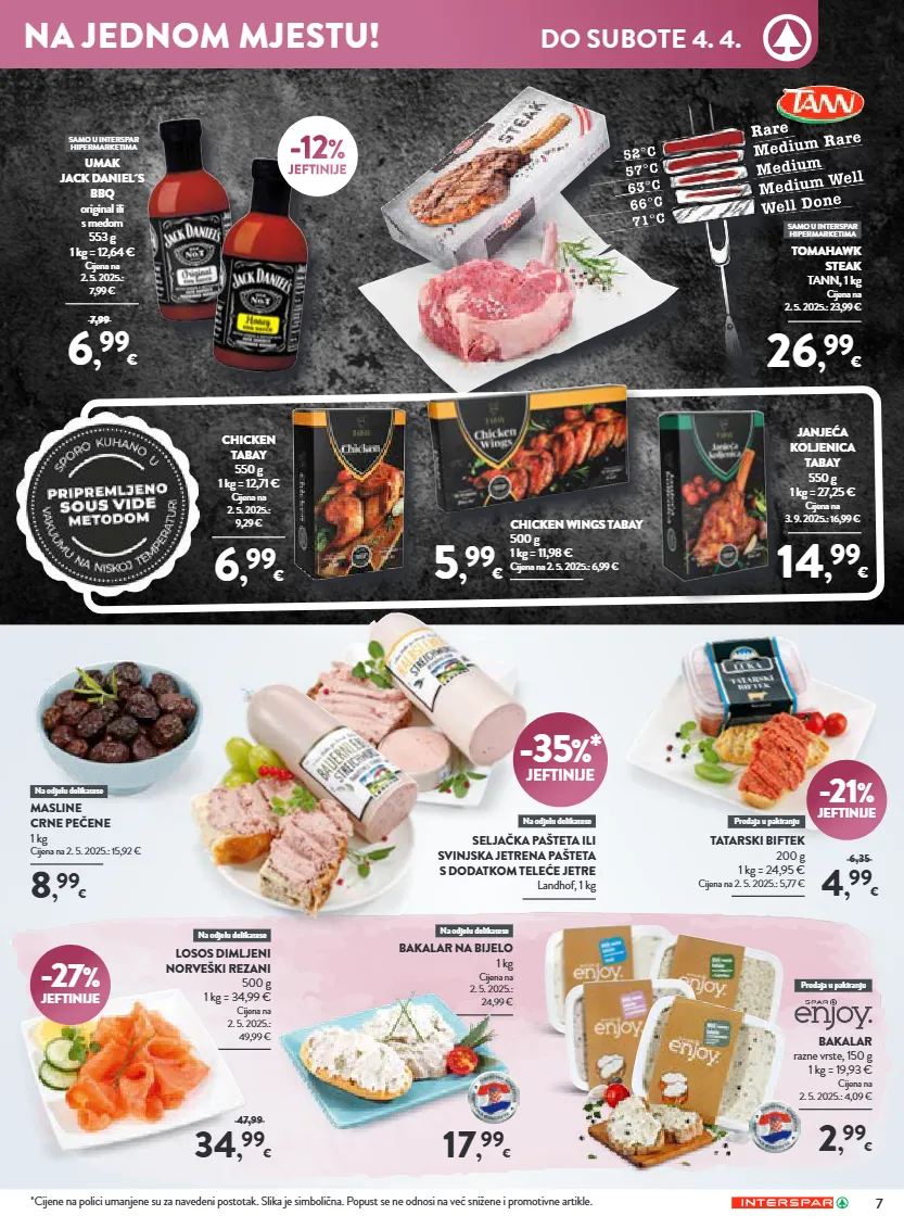 losos dimljeni norveški rezani 500 g 1 kg = 34,99 € cijena na 2. 5. 2025.: 49,99 € bakalar na bijelo 1 kg cijena na 2. 5. 2025.: 24,99 € -27 % jeftinije masline crne pečene 1 kg cijena na 2. 5. 2025.: 15,92 € 8 , 99 € -21 % jeftinije tatarski biftek 200 g 1 kg = 24,95 € cijena na 2. 5. 2025.: 5,77 € 4 , 99 € 6,35 bakalar razne vrste, 150 g 1 kg = 19,93 € cijena na 2. 5. 2025.: 4,09 € 2 , 99 € 17 , 99 € 34 , 99 € 47,99 janjeća koljenica tabay 550 g 1 kg = 27,25 € cijena na 3. 9. 2025.: 16,99 € 14 , 99 € chicken tabay 550 g 1 kg = 12,71 € cijena na 2. 5. 2025.: 9,29 € 6 , 99 € chicken wings tabay 500 g 1 kg = 11,98 € cijena na 2. 5. 2025.: 6,99 € 5 , 99 € -12 % jeftinije umak jack daniel´s bbq original ili s medom 553 g 1 kg = 12,64 € cijena na 2. 5. 2025.: 7,99 € 6 , 99 € 7,99 samo u interspar hipermarketima tomahawk steak tann, 1 kg cijena na 2. 5. 2025.: 23,99 € 26 , 99 € samo u interspar hipermarketima *cijene na polici umanjene su za navedeni postotak. slika je simbolična. popust se ne odnosi na već snižene i promotivne artikle. na odjelu delikatese na odjelu delikatese na odjelu delikatese seljačka pašteta ili svinjska jetrena pašteta s dodatkom teleće jetre landhof, 1 kg na odjelu delikatese prodaja u pakiranju prodaja u pakiranju -35 %* jeftinije 7 na jednom mjestu! do subote 4. 4.