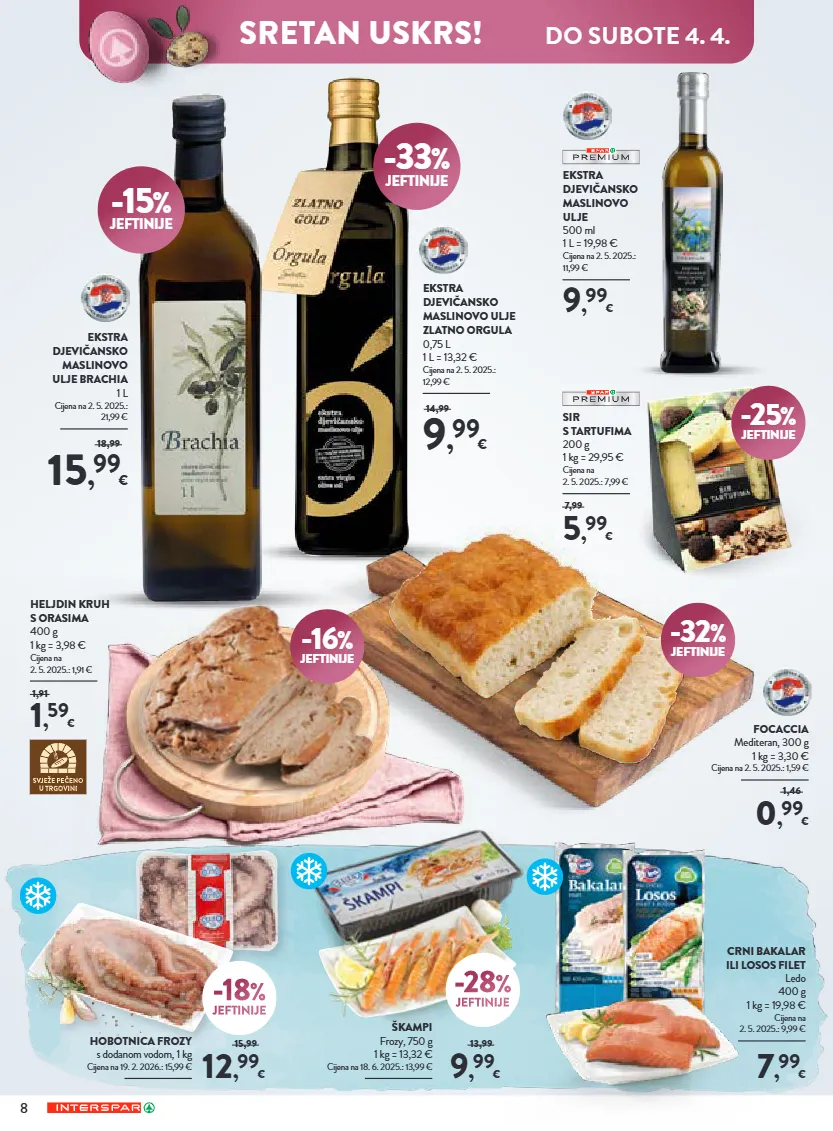8 -16 % jeftinije heljdin kruh s orasima 400 g 1 kg = 3,98 € cijena na 2. 5. 2025.: 1,91 € 1 , 59 € 1,91 -32 % jeftinije focaccia mediteran, 300 g 1 kg = 3,30 € cijena na 2. 5. 2025.: 1,59 € 0 , 99 € 1,46 -25 % jeftinije sir s tartufima 200 g 1 kg = 29,95 € cijena na 2. 5. 2025.: 7,99 € 5 , 99 € 7,99 ekstra djevičansko maslinovo ulje 500 ml 1 l = 19,98 € cijena na 2. 5. 2025.: 11,99 € crni bakalar ili losos filet ledo 400 g 1 kg = 19,98 € cijena na 2. 5. 2025.: 9,99 € 7 , 99 € hobotnica frozy s dodanom vodom, 1 kg cijena na 19. 2. 2026.: 15,99 € 12 , 99 € 15,99 -18 % jeftinije -28 % jeftinije -15 % jeftinije ekstra djevičansko maslinovo ulje brachia 1 l cijena na 2. 5. 2025.: 21,99 € 15 , 99 € 18,99 -33 % jeftinije ekstra djevičansko maslinovo ulje zlatno orgula 0,75 l 1 l = 13,32 € cijena na 2. 5. 2025.: 12,99 € 9 , 99 € 14,99 9 , 99 € 13,99 škampi frozy, 750 g 1 kg = 13,32 € cijena na 18. 6. 2025.: 13,99 € 9 , 99 € do subote 4. 4. sretan uskrs!
