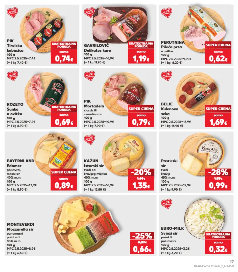 kratkotrajna ponuda kratkotrajna ponuda kratkotrajna ponuda kratkotrajna ponuda kratkotrajna ponuda kratkotrajna ponuda samo samo samo pik mortadela classic ili s maslinama 100 g mpc 2.5.2025=10,9€ (= 1 kg 7,90 €) pik tirolska kobasica 100 g mpc 2.5.2025=7,4€ (= 1 kg 7,40 €) super cijena belje kulenova seka 100 g mpc 2.5.2025=18,9€ (= 1 kg 16,90 €) super cijena kratkotrajna ponuda bayernland edamer polutvrdi, masni sir 40% m.m. 100 g mpc 2.5.2025=13,9€ (= 1 kg 8,90 €) kažun istarski sir tvrdi od kravljeg mlijeka 40% m.m. 100 g mpc 2.5.2025=16,9€ (= 1 kg 13,50 €) pastirski sir tvrdi kravlji 45% m.m. 100 g mpc 2.5.2025=12,9€ (= 1 kg 9,90 €) super cijena -20% -28% monteverdi mozzarella sir punomasni polutvrdi 45% m.m. 100 g mpc 2.5.2025=8,9€ (= 1 kg 6,60 €) euro-milk svježi sir posni ili polumasni 100 g mpc 2.5.2025=3,2€ (= 1 kg 3,20 €) -25% kratkotrajna ponuda (= 1 kg 6,20 €) perutnina pileća prsa u ovitku 100 g mpc 2.5.2025=9,90€ super cijena (= 1 kg 6,90 €) rozeto šunka u ovitku 100 g mpc 2.5.2025=7,2€ kratkotrajna ponuda kratkotrajna ponuda samo 0,79 € samo 1,69 € samo 0,74 € samo 0,89 € 1,35 € 1,69 € 0,99 € 1,39 € 0,66 € 0,89 € samo 0,32 € samo 0,62 € samo 0,69 € samo 1,19 € (= 1 kg 11,90 €) gavrilović delikates kare 100 g mpc 2.5.2025=16,9€ s17-hr-kw13-lft-wuk_2_r-1030-11 17