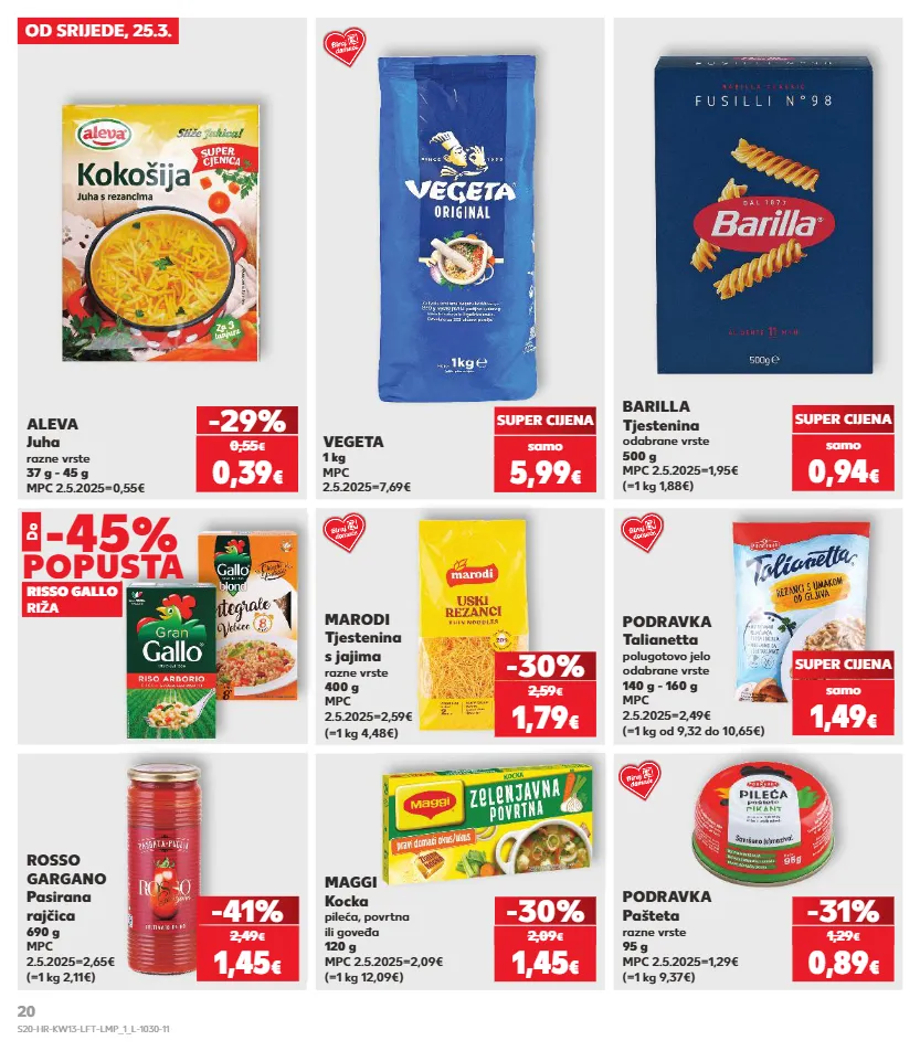 kratkotrajna ponuda kratkotrajna ponuda kratkotrajna ponuda kratkotrajna ponuda kratkotrajna ponuda kratkotrajna ponuda kratkotrajna ponuda samo kratkotrajna ponuda samo samo samo samo samo samo samo od srijede, 25.3. marodi tjestenina s jajima razne vrste 400 g mpc 2.5.2025=2,59€ (=1 kg 4,48€) podravka talianetta polugotovo jelo odabrane vrste 140 g - 160 g mpc 2.5.2025=2,49€ (=1 kg od 9,32 do 10,65€) rosso gargano pasirana rajčica 690 g mpc 2.5.2025=2,65€ (=1 kg 2,11€) maggi kocka pileća, povrtna ili goveđa 120 g mpc 2.5.2025=2,09€ (=1 kg 12,09€) podravka pašteta razne vrste 95 g mpc 2.5.2025=1,29€ (=1 kg 9,37€) -30% super cijena -41% -30% -31% super cijena (=1 kg 1,88€) barilla tjestenina odabrane vrste 500 g mpc 2.5.2025=1,95€ -29% 0,39 € aleva juha razne vrste 37 g - 45 g mpc 2.5.2025=0,55€ super cijena 1,79 € 2,59 € 1,49 € 1,45 € 2,49 € 1,45 € 2,09 € 0,89 € 1,29 € 0,94 € 0,55 € 5,99 € vegeta 1 kg mpc 2.5.2025=7,69€ -45 % popusta risso gallo riža do samo samo samo s20-hr-kw13-lft-lmp_1_l-1030-11 20