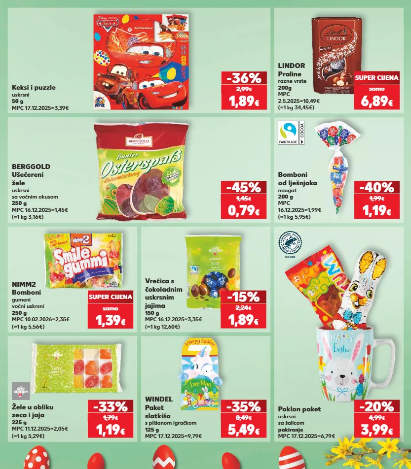 kratkotrajna ponuda kratkotrajna ponuda kratkotrajna ponuda kratkotrajna ponuda kratkotrajna ponuda kratkotrajna ponuda kratkotrajna ponuda samo samo samo samo samo samo samo kratkotrajna ponuda od srijede, 25.3. k-os uskršnji zec razne vrste 150 g mpc 16.12.2025=4,15€ (=1 kg 15,67€) čokoladna jaja razne vrste 150 g mpc 2.5.2025=1,07€ (=1 kg 13,94€) ferrero rocher praline čokoladne 100 g mpc 2.5.2025=3,99€ (=1 kg 32,90€) ferrero rocher ili raffaello uskršnje jaje 100 g mpc 18.02.2026=6,99€ (=1 kg 40,90€) čokoladna jaja uskrsna 100 g mpc 11.12.2025=2,89€ (=1 kg 16,50€) cosmo čokoladni zec s uskršnjim jajima 90 g mpc 11.12.2025=3,25€ (=1 kg 21,-€) moritz čokoladice eiskonfekt 250 g mpc 2.5.2025=0,74€ (=1 kg 6,76€) -40% -21% -17% -31% -41% -40% -42% 2,09 € 3,49 € 2,35 € 2,99 € 3,29 € 3,99 € 4,09 € 5,99 € 1,89 € 3,25 € 1,69 € 2,85 € 1,65 € 2,89 € super cijena (=1 kg 10,90€) kinder čokoladni prutići 100 g mpc 2.5.2025=1,79€ samo 1,09 € slatkiši slatkiši najdraži s22-hr-kw13-lft-aktf1_2_1_l-1030-11 22