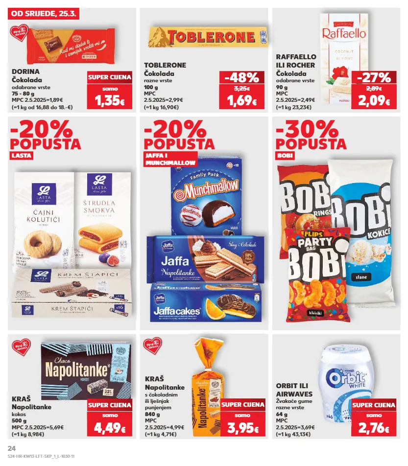 kratkotrajna ponuda kratkotrajna ponuda kratkotrajna ponuda kratkotrajna ponuda kratkotrajna ponuda samo kratkotrajna ponuda samo samo samo samo samo od srijede, 25.3. kraš napolitanke s čokoladnim ili lješnjak punjenjem 840 g mpc 2.5.2025=4,99€ (=1 kg 4,71€) kraš napolitanke kokos 500 g mpc 2.5.2025=5,69€ (=1 kg 8,98€) orbit ili airwaves žvakaće gume razne vrste 64 g mpc 2.5.2025=3,69€ (=1 kg 43,13€) super cijena super cijena super cijena -27% (=1 kg 23,23€) raffaello ili rocher čokolada odabrane vrste 90 g mpc 2.5.2025=2,49€ super cijena 1,35 € (=1 kg od 16,88 do 18.-€) dorina čokolada odabrane vrste 75 - 80 g mpc 2.5.2025=1,89€ -48% 3,95 € 4,49 € 2,76 € 2,09 € 2,89 € 1,69 € 3,25 € (=1 kg 16,90€) toblerone čokolada razne vrste 100 g mpc 2.5.2025=2,99€ bobi lasta -30% -20% jaffa i munchmallow -20% popusta popusta popusta samo samo samo samo s24-hr-kw13-lft-skp_1_l-1030-11 24