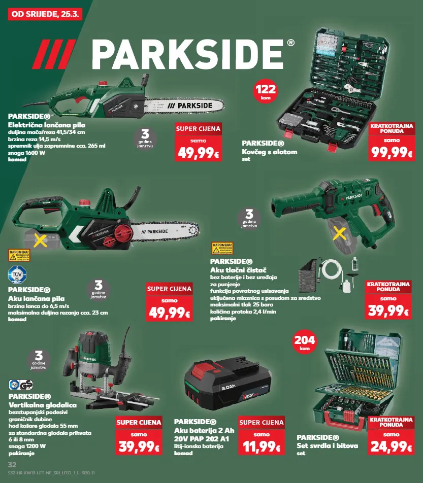 69,99 € 14,95 € kratkotrajna ponuda od srijede, 25.3. parkside® aku lančana pila brzina lanca do 6,5 m/s maksimalna duljina rezanja cca. 23 cm komad parkside® električna lančana pila duljina mača/reza 41,5/34 cm brzina reza 14,5 m/s spremnik ulja zapremnine cca. 265 ml snaga 1600 w komad parkside® aku tlačni čistač bez baterije i bez uređaja za punjenje funkcija povratnog usisavanja uključena mlaznica s posudom za sredstvo maksimalni tlak 25 bara količina protoka 2,4 l/min pakiranje parkside® vertikalna glodalica bezstupanjski podesivi graničnik dubine hod košare glodala 55 mm za standardna glodala prihvata 6 ili 8 mm snaga 1200 w pakiranje parkside® aku baterija 2 ah 20v pap 202 a1 litij-ionska baterija komad parkside® set svrdla i bitova set parkside® kovčeg s alatom set kratkotrajna ponuda super cijena super cijena super cijena - - super cijena 33% super cijena 33% 33% super cijena kratkotrajna ponuda super cijena super cijena super cijena - - super cijena 20% super cijena 20% 20% super cijena kratkotrajna ponuda super cijena kratkotrajna ponuda super cijena super cijena super cijena - - super cijena 19% super cijena 19% 19% super cijena kratkotrajna ponuda kratkotrajna ponuda samo 49,99 € 74,99 samo 74,99 samo 74,99 samo 74,99 samo samo € samo € o samo 49,99 € samo 39,99 € samo 39,99 € samo 11,99 € samo 99,99 € samo 24,99 € 3 3 3 3 122 kom 204 kom s32-hr-kw13-lft-nf_sri_uto_1_l-1030-11 32