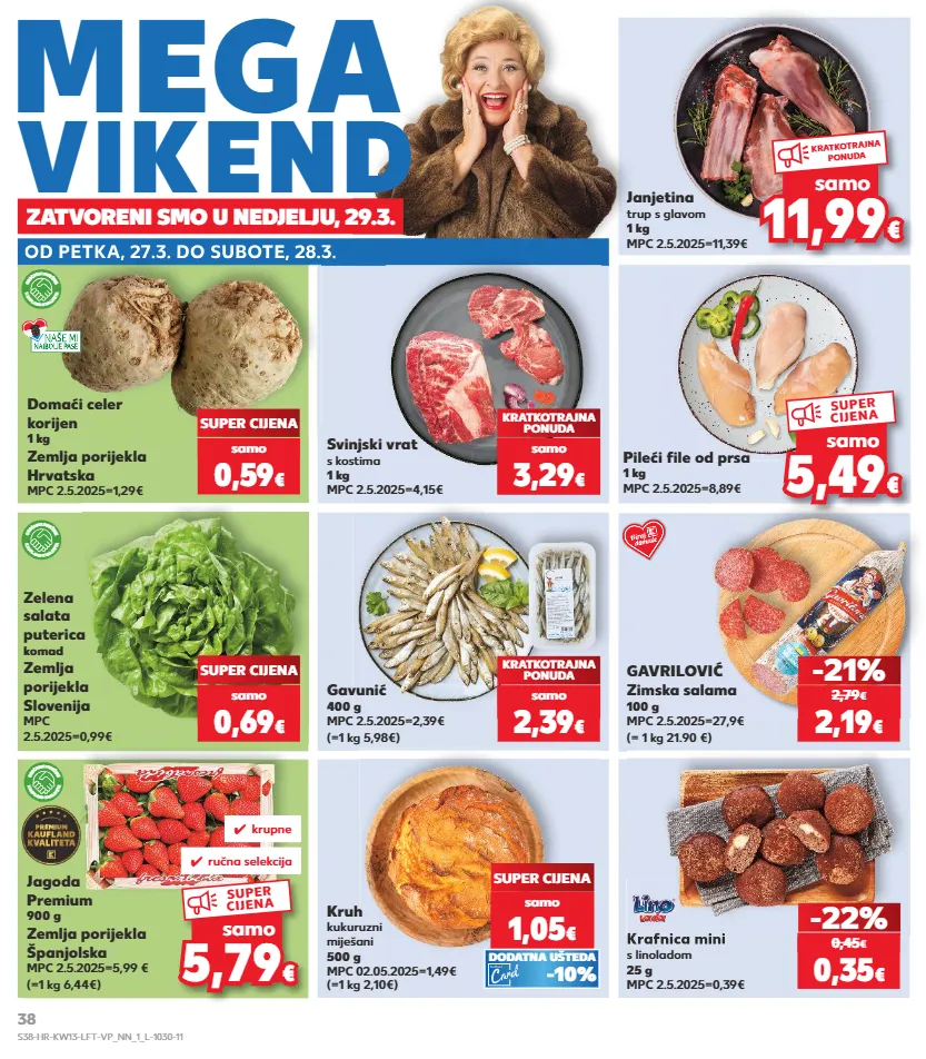 -42% 1,19 € 0,99 € -40% 0,99 € kratkotrajna ponuda kratkotrajna ponuda kratkotrajna ponuda kratkotrajna ponuda samo samo kratkotrajna ponuda od petka, 27.3. do subote, 28.3. vikend mega zatvoreni smo u nedjelju, 29.3. od petka, 27.3. do subote, 28.3. svinjski vrat s kostima 1 kg mpc 2.5.2025=4,15€ domaći celer korijen 1 kg zemlja porijekla hrvatska mpc 2.5.2025=1,29€ pileći file od prsa 1 kg mpc 2.5.2025=8,89€ zelena salata puterica komad zemlja porijekla slovenija mpc 2.5.2025=0,99€ gavunić 400 g mpc 2.5.2025=2,39€ (=1 kg 5,98€) gavrilović zimska salama 100 g mpc 2.5.2025=27,9€ (= 1 kg 21.90 €) jagoda premium 900 g zemlja porijekla španjolska mpc 2.5.2025=5,99 € (=1 kg 6,44€) krafnica mini s linoladom 25 g mpc 2.5.2025=0,39€ k a u f l a n d k v a l i t e t a o b e ć a n j e s v j e ž i n e k a u f l a n d k v a l i t e t a o b e ć a n j e s v j e ž i n e krafnica mini k a u f l a n d k v a l i t e t a o b e ć a n j e s v j e ž i n e kratkotrajna ponuda kratkotrajna ponuda -22% -21% janjetina trup s glavom 1 kg mpc 2.5.2025=11,39€ super cijena samo 0,59 € samo 3,29 € super cijena samo 0,69 € samo 2,39 € 0,35 € 0,45 € 2,19 € 2,79 € (=1 kg 2,10€) kruh kukuruzni miješani 500 g mpc 02.05.2025=1,49€ samo 1,05 € super cijena -10% dodatna ušteda 5,7 9 5,79 € € samo super cijena 5,4 9 5,49 € € samo super cijena ✓ krupne ✓ ručna selekcija 11,99 11,99 € € samo kratkotrajna ponuda s38-hr-kw13-lft-vp_nn_1_l-1030-11 38