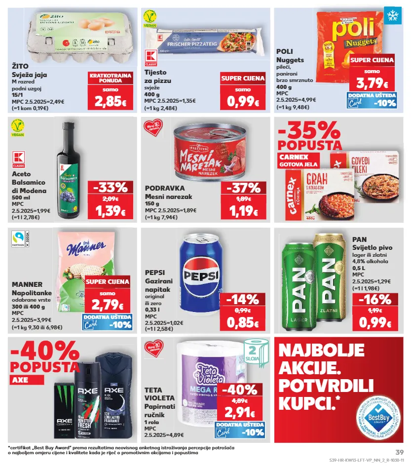4,99 € super cijena 2,79 € kratkotrajna ponuda samo kratkotrajna ponuda kratkotrajna ponuda samo kratkotrajna ponuda samo kratkotrajna ponuda samo kratkotrajna ponuda samo -24% kratkotrajna ponuda kratkotrajna ponuda podravka mesni narezak 150 g mpc 2.5.2025=1,89€ (=1 kg 7,94€) -37% (=1 kom 0,19€) žito svježa jaja m razred podni uzgoj 15/1 mpc 2.5.2025=2,49€ kratkotrajna ponuda 1,19 € 1,89 € tijesto za pizzu svježe 400 g mpc 2.5.2025=1,35€ (=1 kg 2,48€) super cijena samo 0,99 € pepsi gazirani napitak original ili zero 0,33 l mpc 2.5.2025=1,02€ (=1 l 2,58€) -14% 0,85 € 0,99 € pan svijetlo pivo lager ili zlatni 4,8% alkohola 0,5 l mpc 2.5.2025=1,29€ (=1 l 1,98€) -16% 0,99 € 1,19 € samo 2,85 € (=1 l 2,78€) aceto balsamico di modena 500 ml mpc 2.5.2025=1,99€ -33% 1,39 € 2,09 € carnex gotova jela -35% popusta teta violeta papirnati ručnik 1 rola mpc 2.5.2025=4,89€ 2,91 € -40% 4,89 € -10% dodatna ušteda (=1 kg 9,48€) poli nuggets pileći, panirani brzo smrznuto 400 g mpc 2.5.2025=4,99€ samo 3,79 € super cijena -10% dodatna ušteda (=1 kg 9,30 ili 6,98€) manner napolitanke odabrane vrste 300 ili 400 g mpc 2.5.2025=3,99€ samo 2,79 € super cijena -10% dodatna ušteda 2 sloja axe -40% popusta najbolje akcije. potvrdili kupci. * *certifikat „best buy award“ prema rezultatima neovisnog anketnog istraživanja percepcije potrošača o najboljem omjeru cijene i kvalitete kada je riječ o promotivnim akcijama i popustima s39-hr-kw13-lft-vp_nn_2_r-1030-11 39