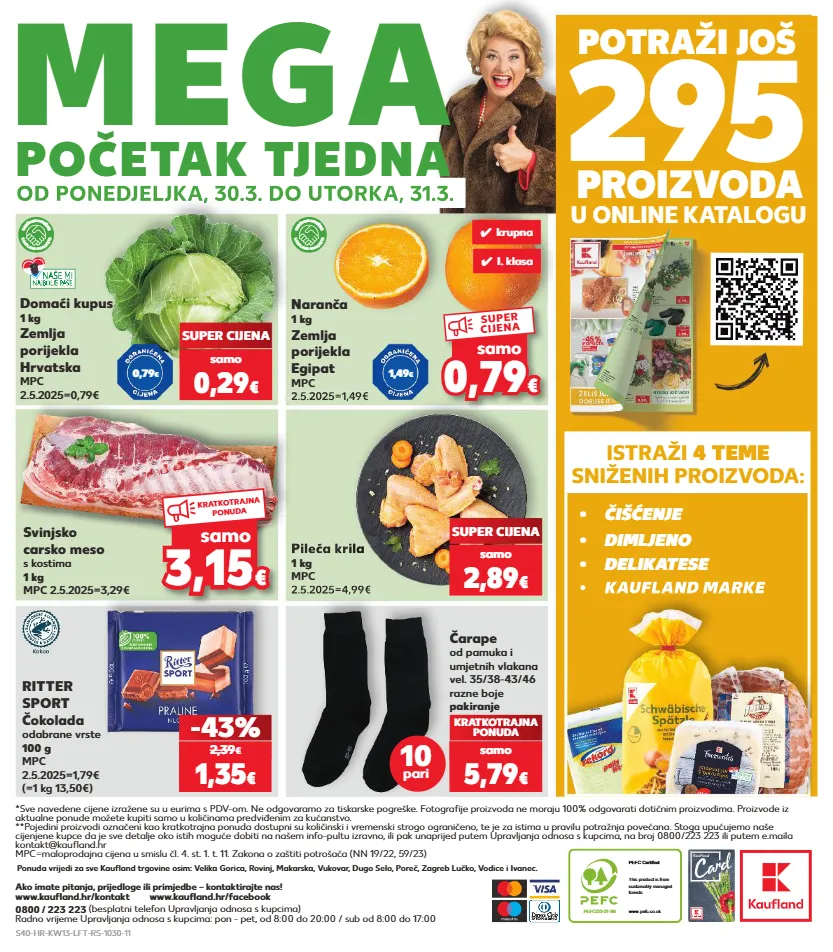 kratkotrajna ponuda kratkotrajna ponuda kratkotrajna ponuda samo pefc/23-31-86 pefc certified this product is from sustainably managed forests www.pefc.co.uk *sve navedene cijene izražene su u eurima s pdv-om. ne odgovaramo za tiskarske pogreške. fotografije proizvoda ne moraju 100% odgovarati dotičnim proizvodima. proizvode iz aktualne ponude možete kupiti samo u količinama predviđenim za kućanstvo. **pojedini proizvodi označeni kao kratkotrajna ponuda dostupni su količinski i vremenski strogo ograničeno, te je za istima u pravilu potražnja povećana. stoga upućujemo naše cijenjene kupce da je sve detalje oko istih moguće dobiti na našem info-pultu izravno, ili pak unaprijed putem upravljanja odnosa s kupcima, na broj 0800/223 223 ili putem e.maila kontakt@kaufland.hr mpc=maloprodajna cijena u smislu čl. 4. st. 1. t. 11. zakona o zaštiti potrošača (nn 19/22, 59/23) 0800 / 223 223 (besplatni telefon upravljanja odnosa s kupcima) radno vrijeme upravljanja odnosa s kupcima: pon - pet, od 8:00 do 20:00 / sub od 8:00 do 17:00 ako imate pitanja, prijedloge ili primjedbe – kontaktirajte nas! www.kaufland.hr/kontakt www.kaufland.hr/facebook ponuda vrijedi za sve kaufl and trgovine osim: velika gorica, rovinj, makarska, vukovar, dugo selo, poreč, zagreb lučko, vodice i ivanec. od ponedjeljka, 30.3. do utorka, 31.3. od ponedjeljka, 30.3. do utorka, 31.3. od ponedjeljka, 30.3. do utorka, 31.3. 295 u online katalogu potraži još proizvoda istraži 4 teme sniženih proizvoda: • čišćenje • kaufland marke • delikatese • dimljeno početak tjedna mega domaći kupus 1 kg zemlja porijekla hrvatska mpc 2.5.2025=0,79€ k a u f l a n d k v a l i t e t a o b e ć a n j e s v j e ž i n e k a u f l a n d k v a l i t e t a o b e ć a n j e s v j e ž i n e super cijena naranča 1 kg zemlja porijekla egipat mpc 2.5.2025=1,49€ svinjsko carsko meso s kostima 1 kg mpc 2.5.2025=3,29€ pileća krila 1 kg mpc 2.5.2025=4,99€ 2.5.2025=1,49€ pileća krila 2.5.2025=4,99€ super cijena ritter sport čokolada odabrane vrste 100 g mpc 2.5.2025=1,79€ (=1 kg 13,50€) čarape od pamuka i umjetnih vlakana vel. 35/38-43/46 razne boje pakiranje kratkotrajna ponuda samo 0,29 € samo 2,89 € -43% 1,35 € 2,39 € samo 5,79 € 10 pari 0,79 € 1,49 € kaufland marke ✓ krupna ✓ i. klasa 3,15 3,15 € € samo kratkotrajna ponuda 0,7 9 0,79 € € samo super cijena s40-hr-kw13-lft-rs-1030-11