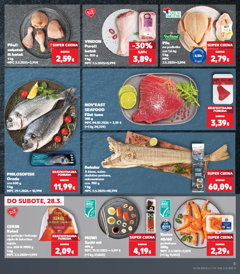 kratkotrajna ponuda kratkotrajna ponuda kratkotrajna ponuda kratkotrajna ponuda kratkotrajna ponuda kratkotrajna ponuda samo do subote, 28.3. philosofish orada cca 650 g 1 kg mpc 29.1.2026.= 10,99€ kozice 40/60 prokuhane 200g mpc 2.5.2025=2,87€ (=1 kg 11,45€) bakalar a klasa, sušen dodatno prešano, vakuumirano cca. 700 g 1 kg mpc 2.5.2025=48,99€ kratkotrajna ponuda super cijena super cijena cekin kokoš za pečenje i kuhanje cijela ili četvrtina svježe cca. 650 ili 2800 g 1 kg mpc 2.5.2025=1,99€ mowi sushi set 199 g mpc 31.12.2025 = 5,99 € (=1 kg 21,06€) kratkotrajna ponuda super cijena č i s t a k v a l i t e t a pile na podlošku cca 1,6 kg 1 kg mpc 2.5.2025=3,09€ super cijena pileći zabatak ili batak 1 kg mpc 2.5.2025=3,99€ super cijena samo 11,99 € samo 2,29 € samo 60,09 € samo 2,09 € samo 4,19 € nov‘east seafood filet tune 140 g mpc 04.02.2026 = 3,39 € (=1 kg 24,22€) kratkotrajna ponuda samo 3,39 € samo 2,79 € samo 2,59 € vindon pureći batak ca. 850 g 1 kg mpc 2.5.2025=5,99€ -30% 3,89 € 5,59 € 3,32 € s5-hr-kw13-lft-fp_sub_2_r-1030-11 5