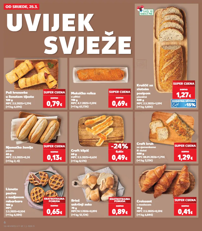kratkotrajna ponuda kratkotrajna ponuda kratkotrajna ponuda kratkotrajna ponuda samo kratkotrajna ponuda kratkotrajna ponuda kratkotrajna ponuda svježe svježe uvijek od srijede, 25.3. poli hrenovka u lisnatom tijestu 120 g mpc 2.5.2025=1,29€ (=1 kg 6,59€) njemačka žemlja pecivo 65 g mpc 2.5.2025=0,2€ (=1 kg 2,-€) croissant s maslacem 70 g mpc 2.5.2025=0,59€ (=1 kg 6,84€) super cijena super cijena super cijena kratkotrajna ponuda samo 0,65 € (=1 kg 6,50€) lisnato pecivo s nadjevom rabarbare 100 g mpc 2.5.2025=0,55€ samo 0,79 € samo 0,13 € samo 0,41 € brioš uskršnji zeko 70 g mpc14.1.2026=0,89€ (=1 kg 12,72€) kratkotrajna ponuda craft klipić 60 g mpc 2.5.2025=0,62€ (=1 kg 8,17€) -24% 0,49 € 0,65 € samo 0,89 € super cijena (=1 kg 62,73€) meksička rolica u plitici 110 g mpc 4.7.2025=1,59€ craft kruh sa sjemenkama ili zlatni 400 g mpc 08.01.2026=1,79€ (=1 kg 3,23€) super cijena samo 1,29 € samo 0,69 € (=1 kg 3,03€) kruščić sa zlatnim posipom pšenični 420 g mpc 2.5.2025=1,59€ samo 1,27 € super cijena -15% dodatna ušteda s6-hr-kw13-lft-bp_1_l-1030-11 6